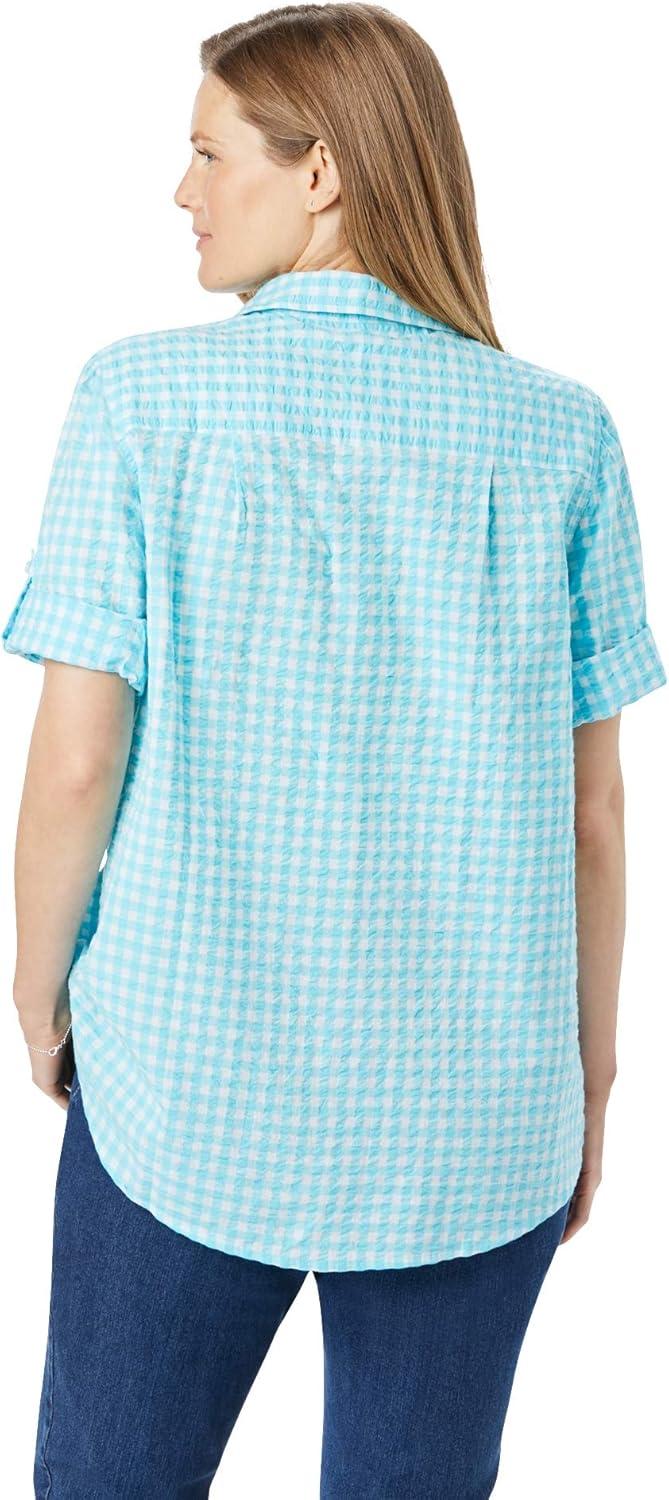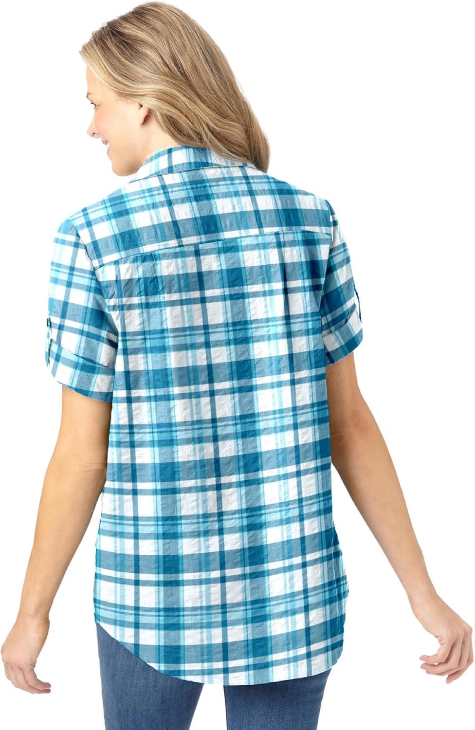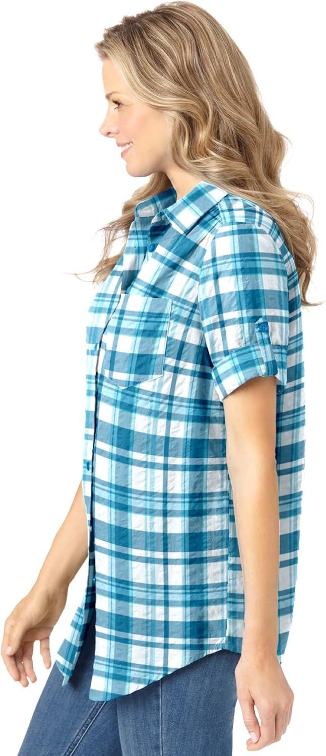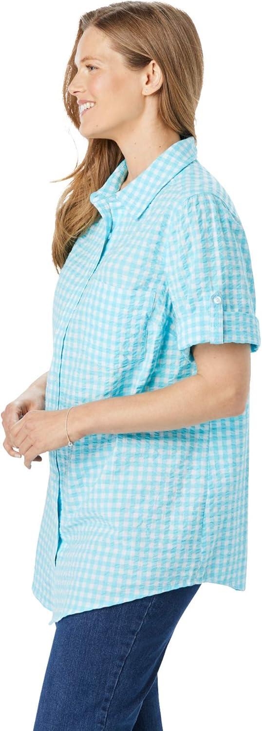 Woman Within Plus Size Short-Sleeve Button Down Seersucker Shirt(Paradise Blue Plaid)
