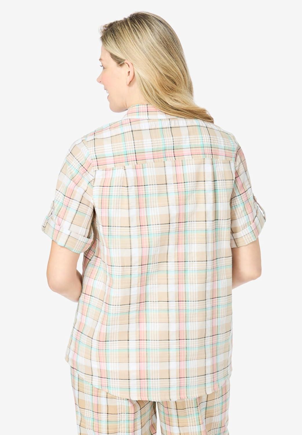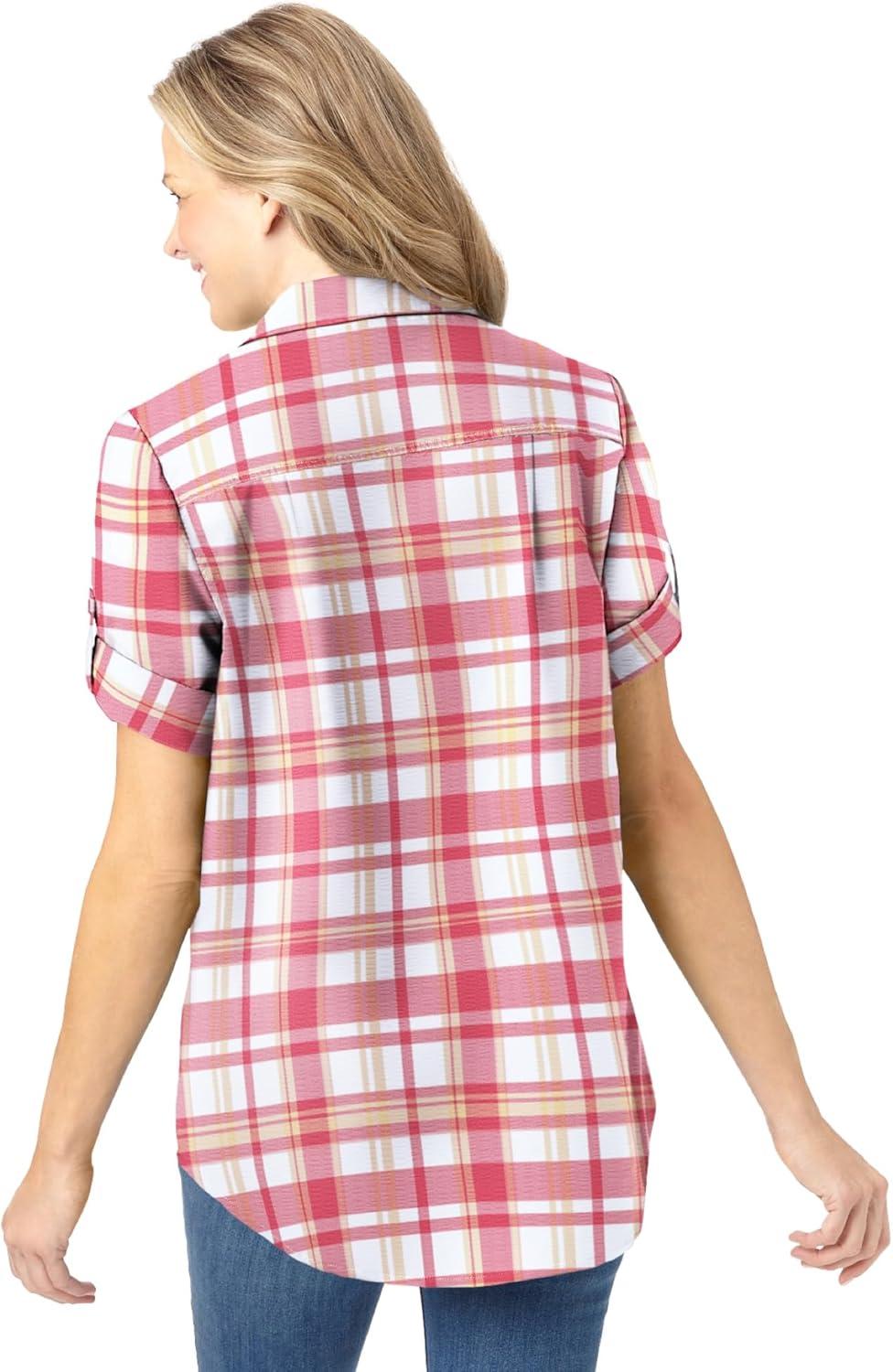 Woman Within Plus Size Short-Sleeve Button Down Seersucker Shirt(Rose Pink Camp Plaid)