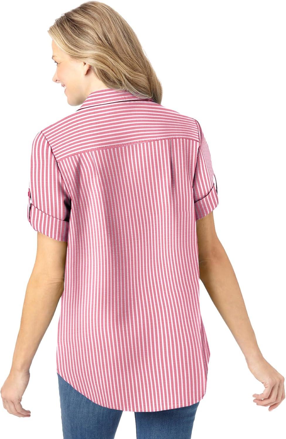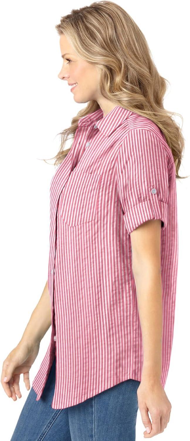 Woman Within Plus Size Short-Sleeve Button Down Seersucker Shirt(Raspberry Sorbet Pop Stripe)