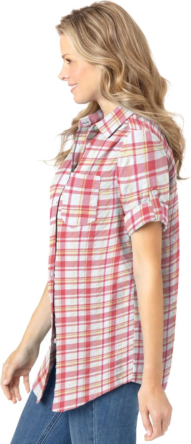 Woman Within Plus Size Short-Sleeve Button Down Seersucker Shirt(Raspberry Sorbet Camp Plaid)