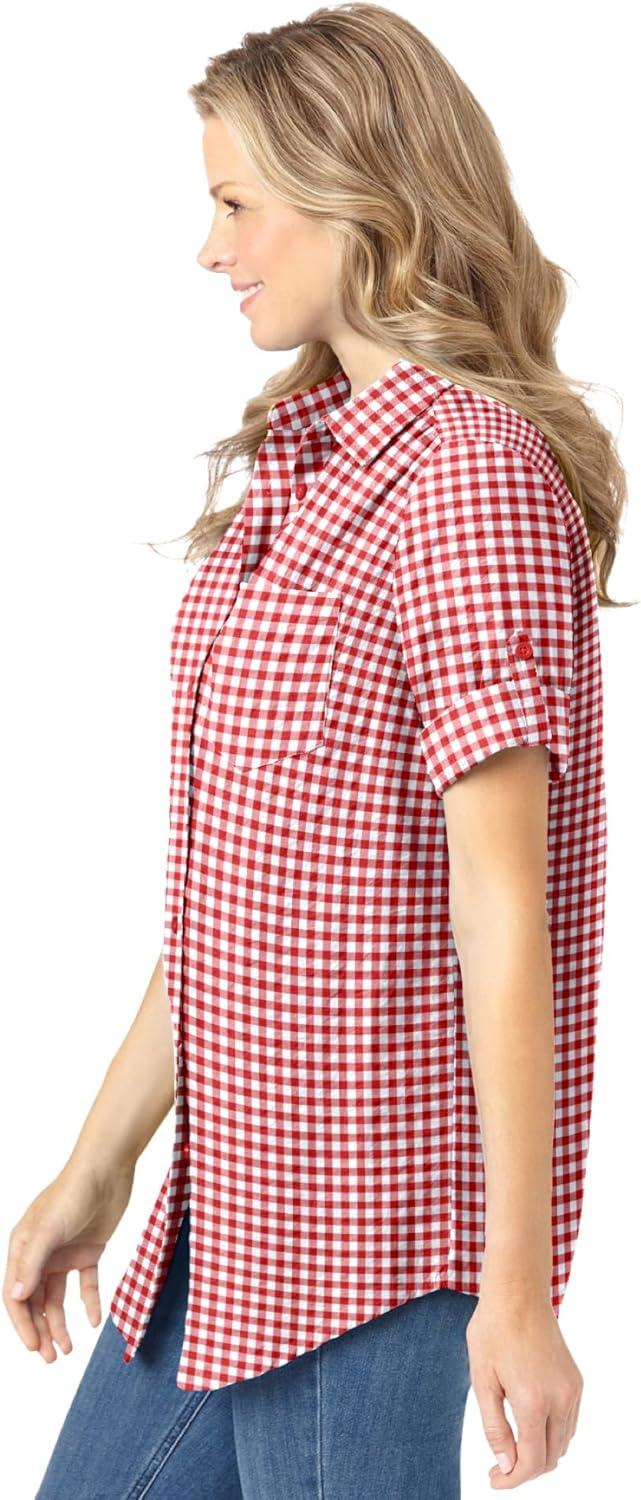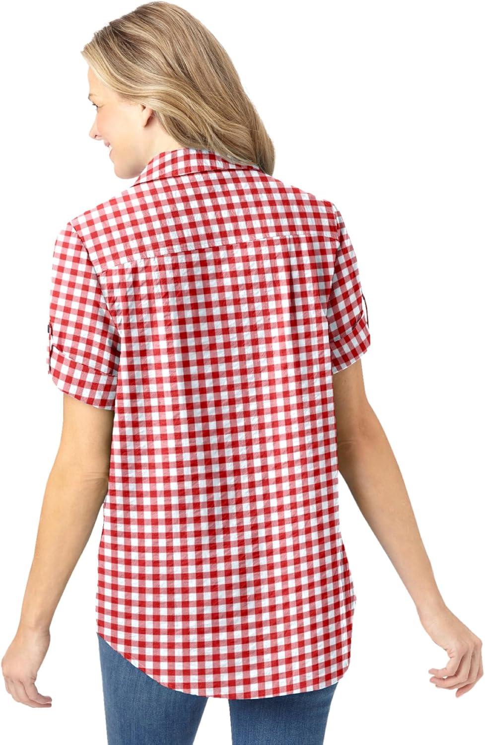 Woman Within Plus Size Short-Sleeve Button Down Seersucker Shirt(Vivid Red Gingham)
