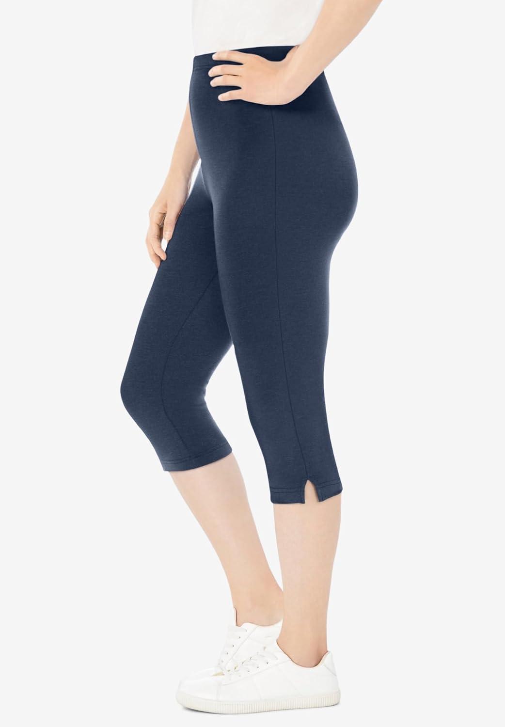 Woman Within Plus Size Stretch-Cotton Knit Pull-On Capri Leggings(Heather Navy)