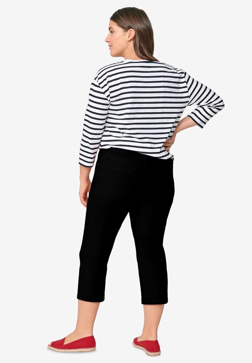 ellos Plus Size Ribbed Elastic Waist Linen-Blend Capris(Black)