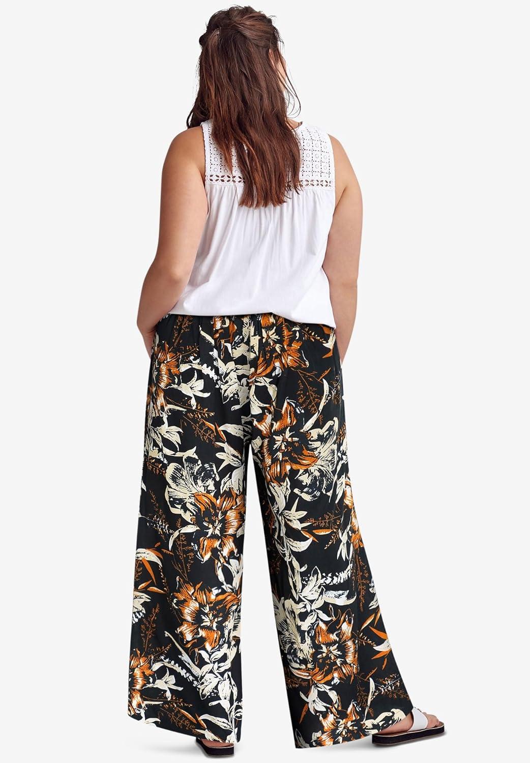 ellos Plus Size Wide-Leg Soft Pants with Back Elastic(Black Beige Floral)