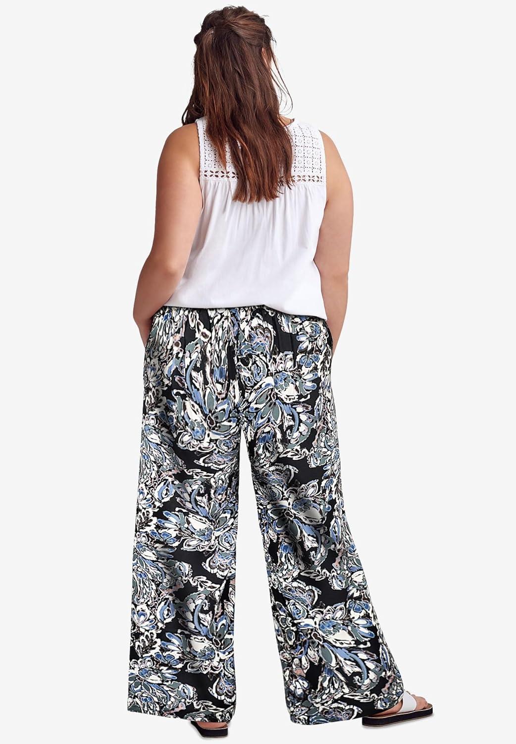 ellos Plus Size Wide-Leg Soft Pants with Back Elastic(Black Dusty Blue Floral)