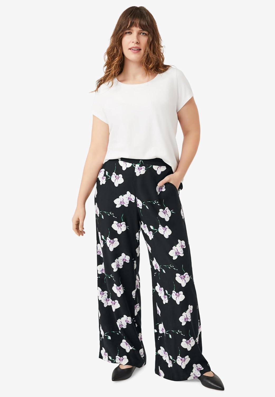 ellos Plus Size Woven Soft Pants(Black Rose Floral)