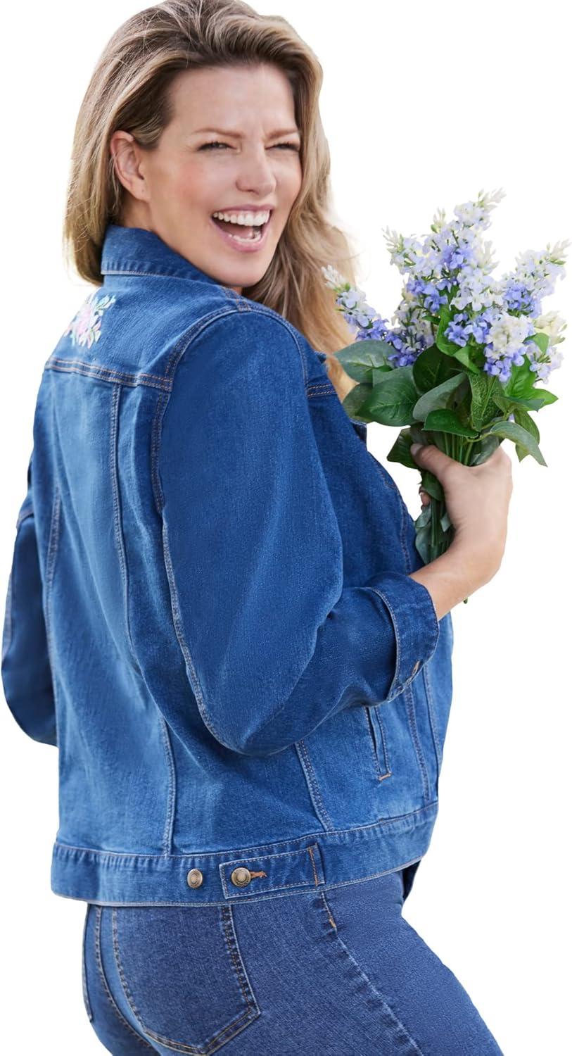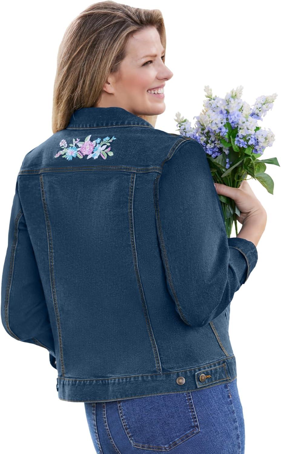Woman Within Plus Size Stretch Denim Jacket Cropped Jean Jacket(Stonewash Floral)