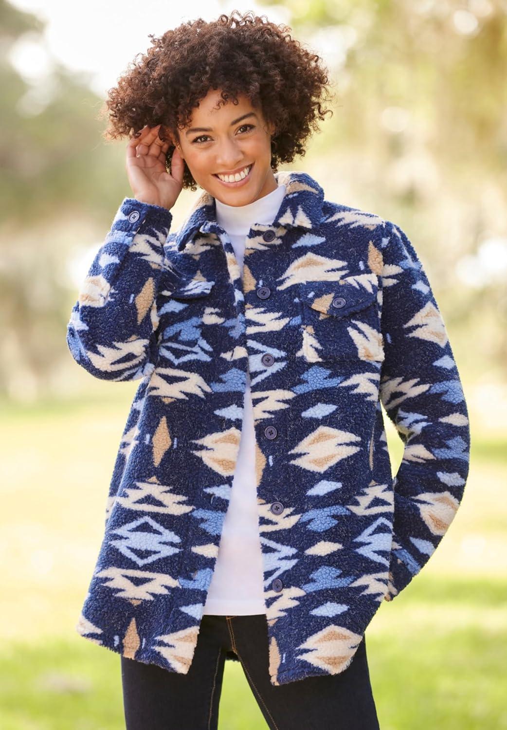 Woman Within Plus Size Berber Shirt Jacket Long Oversized Fuzzy Fleece Shacket(Evening Blue Aztec)