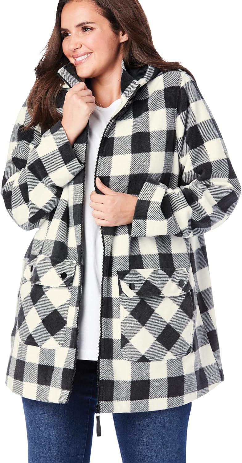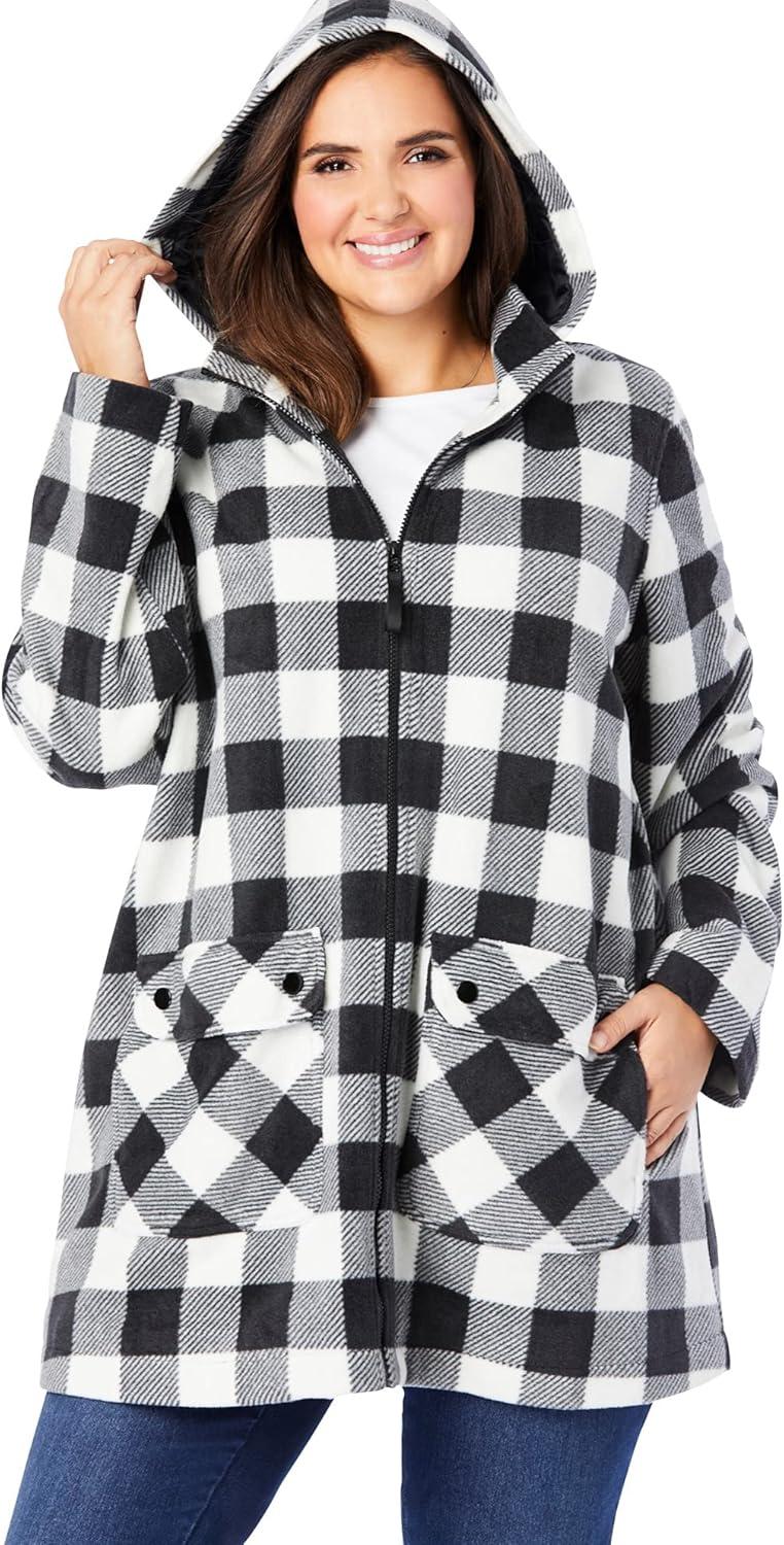 Woman Within Plus Size Hooded Fleece Coat(Black Buffalo Plaid)