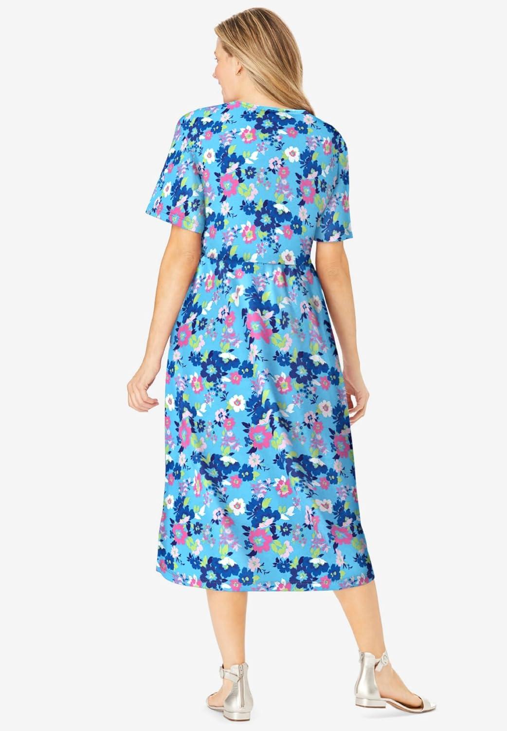 Woman Within Plus Size Short-Sleeve Button-Front Pocket Dress (Petite Available) – S, Paradise Blue Multi Garden