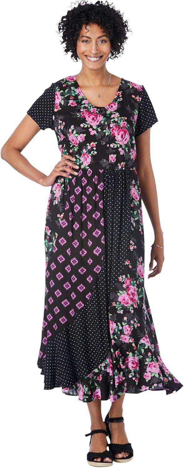 Woman Within Plus Size Mixed Print Maxi Dress(Black Pretty Rose)