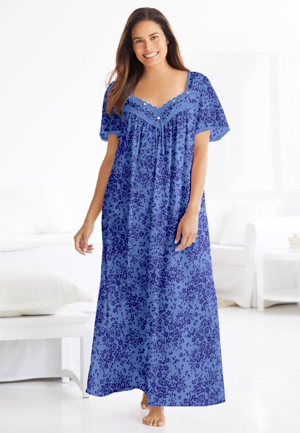 • Only Necessities Plus Size Long Silky Lace-Trim Gown(French Blue Flower)