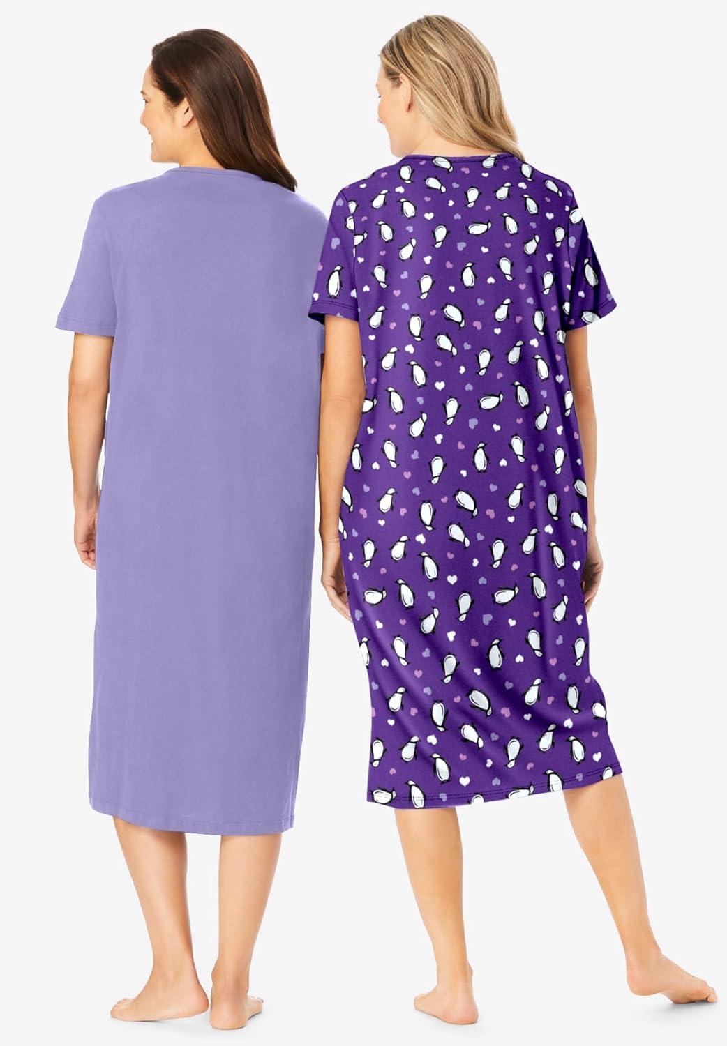 Dreams & Co. Plus Size 2-Pack Long Sleepshirts(Plum Burst Penguins)