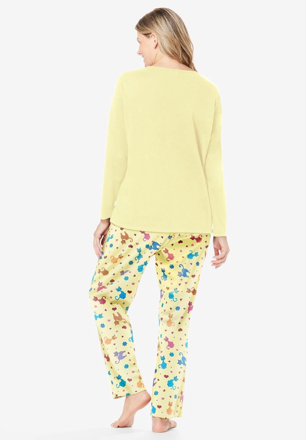 Dreams & Co. Plus Size Long Sleeve Knit PJ Set(Yellow Cats)