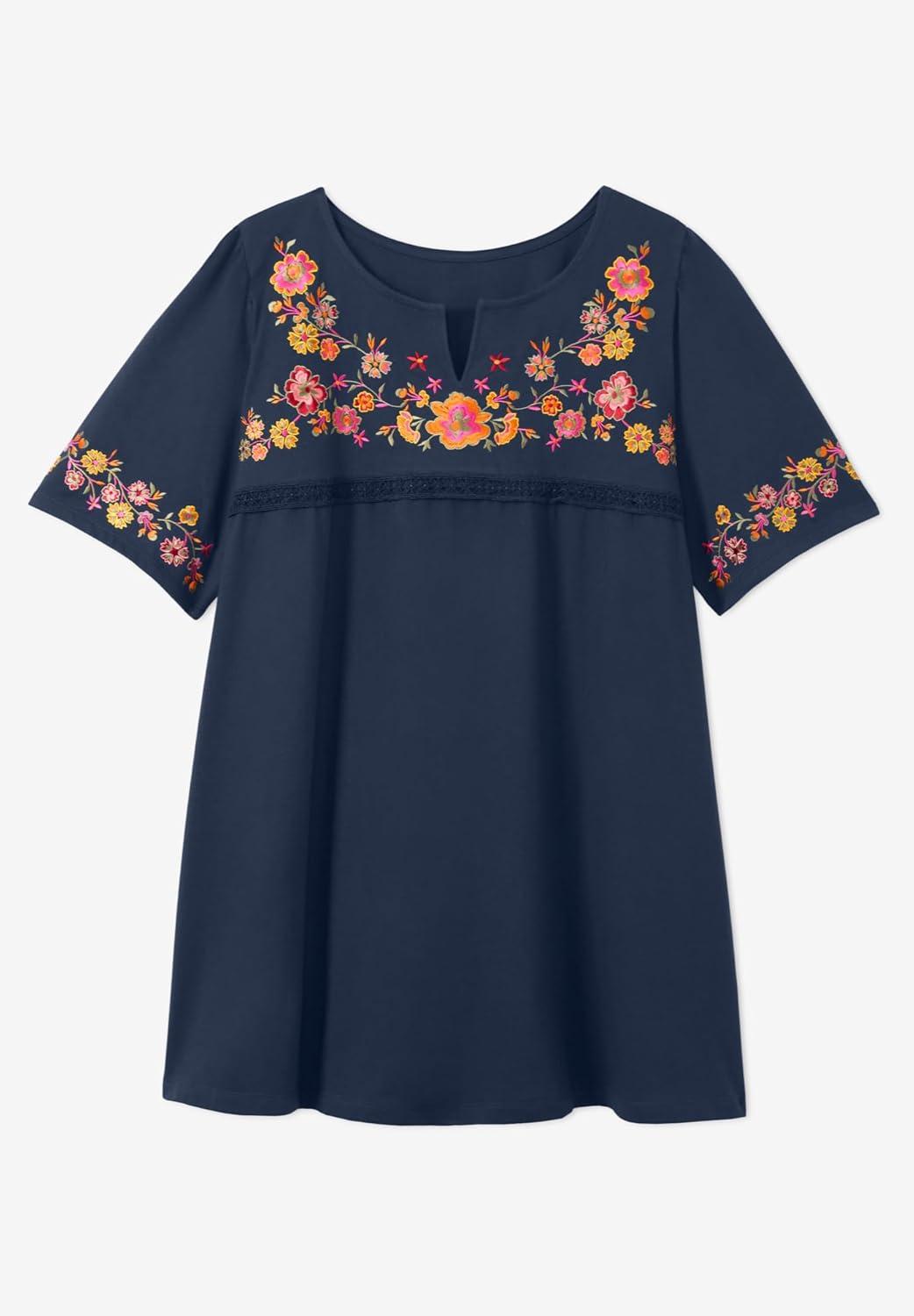 Woman Within Plus Size Embroidered Split-Neck Tunic(Navy Floral Embroidery)