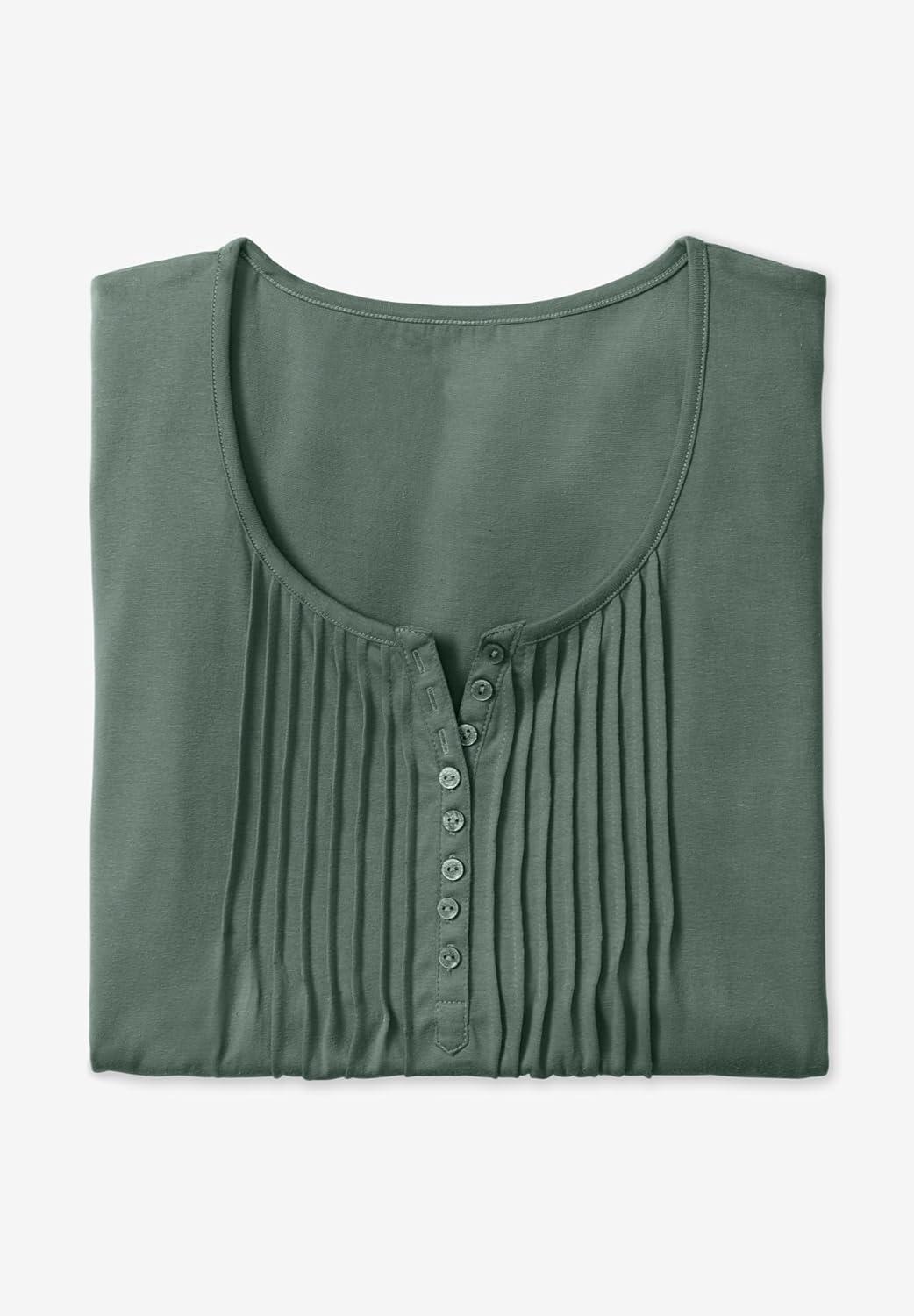 Woman Within Plus Size 7-Day Three-Quarter Sleeve Pintucked Henley Tunic(Black Magnolia)