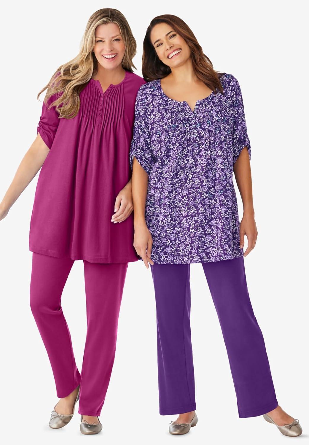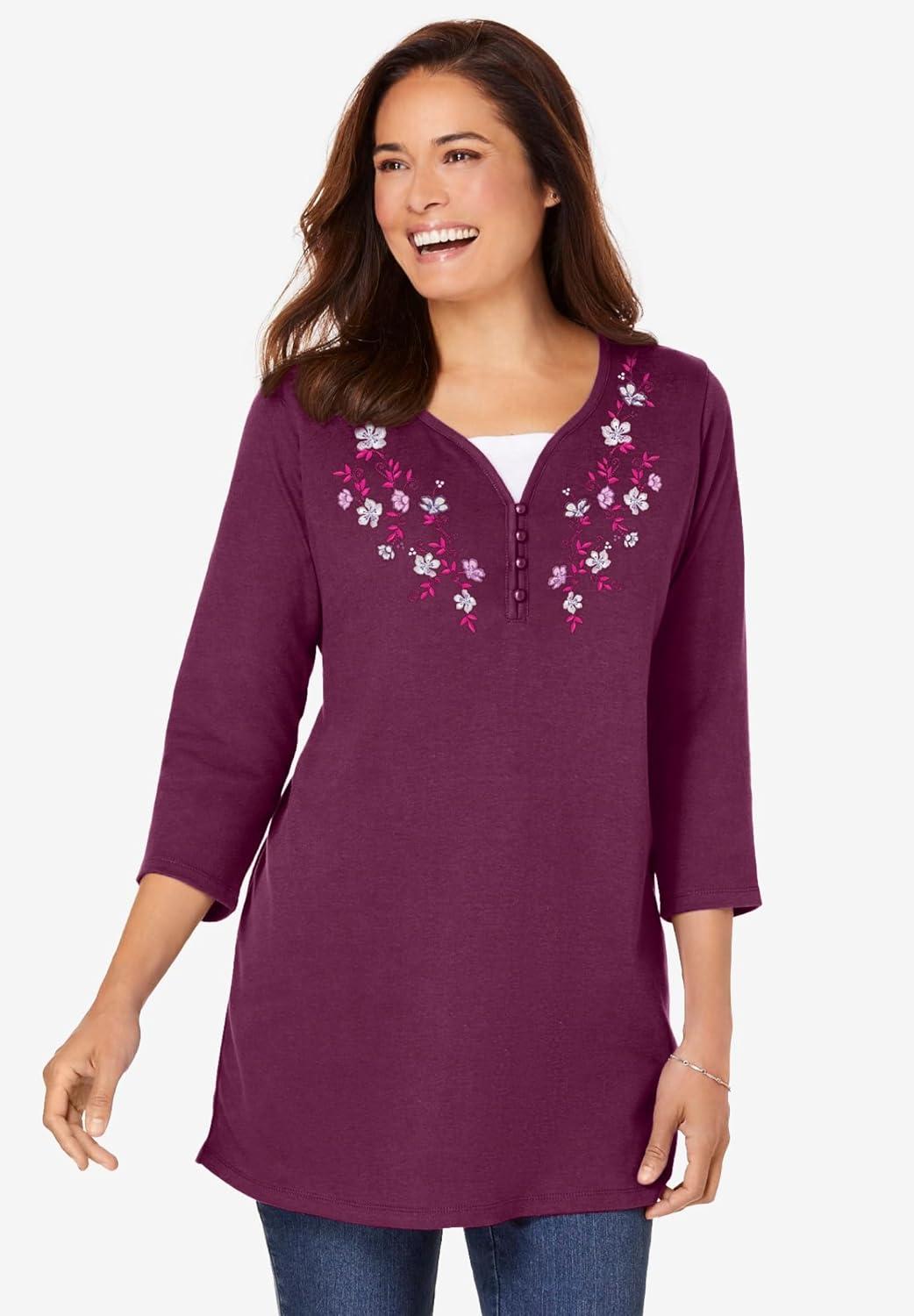 Woman Within Plus Size 7-Day Layered-Look Embroidered Henley Tunic(Radiant Purple Embroidery)