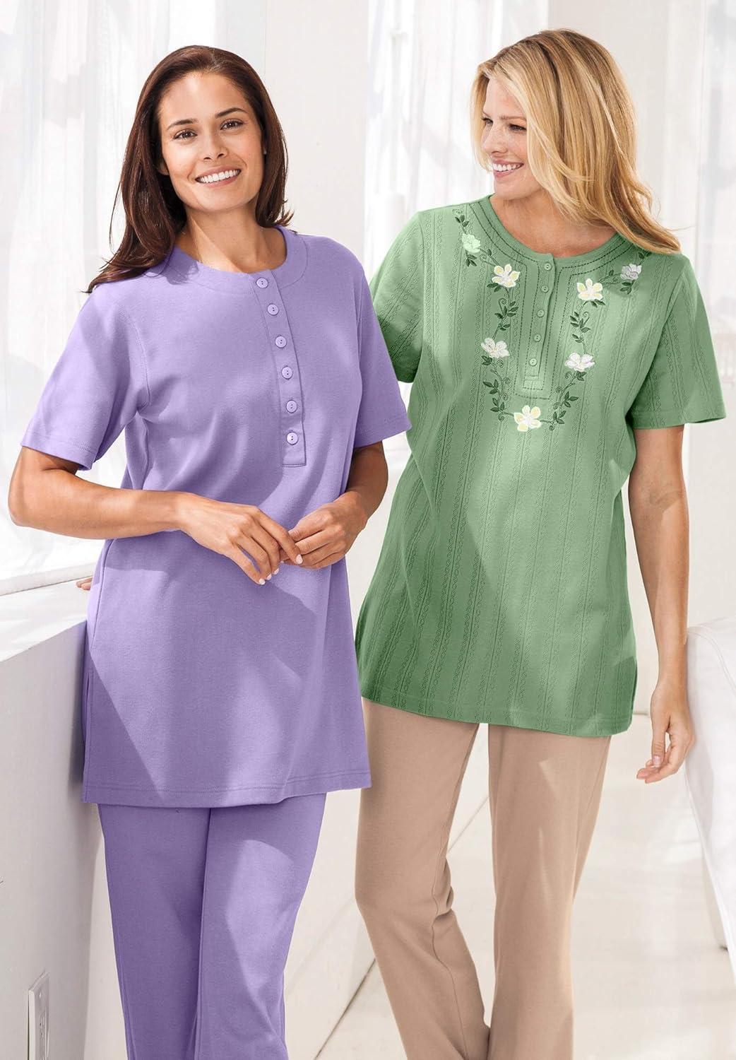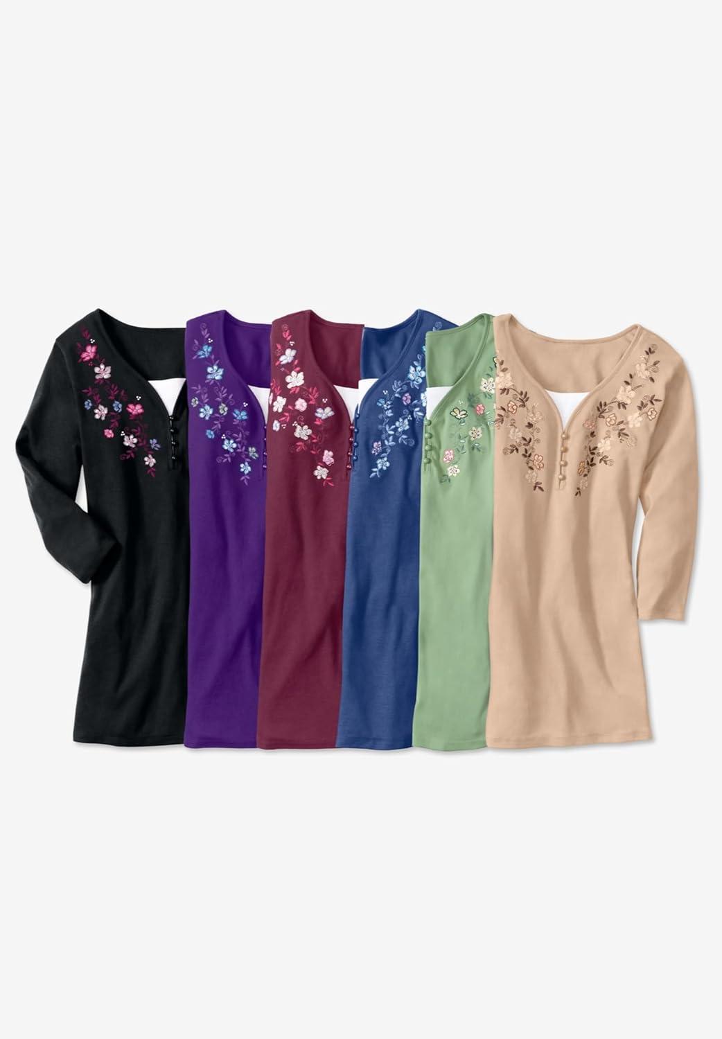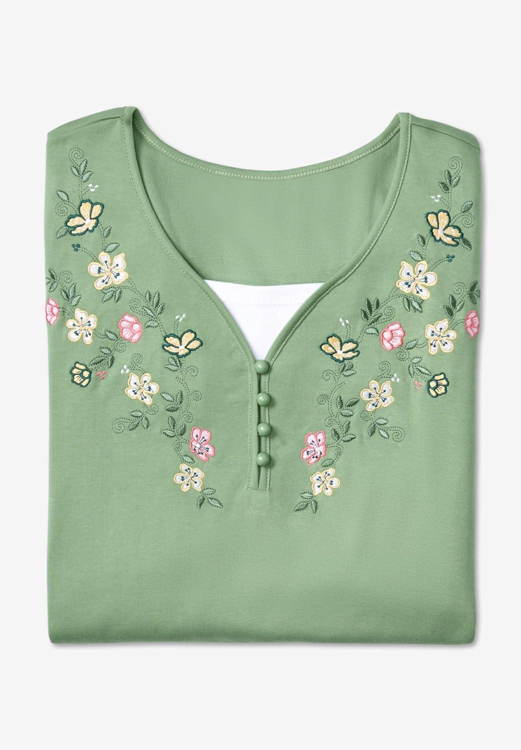 Woman Within Plus Size 7-Day Layered-Look Embroidered Henley Tunic(Sage Flower Embroidery)