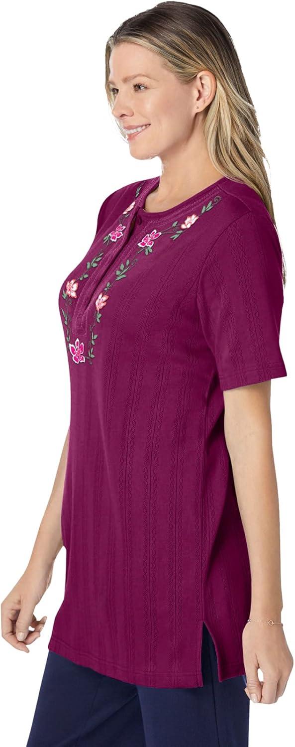 Woman Within Plus Size 7-Day Layered-Look Embroidered Henley Tunic(Deep Claret Embroidery)