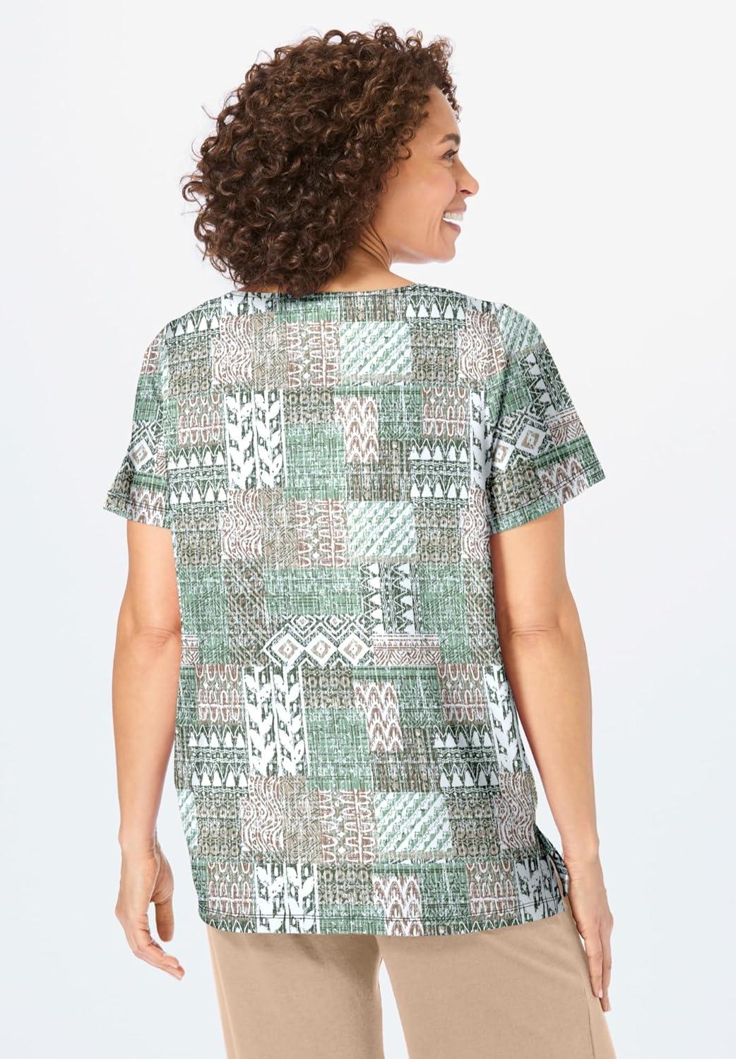 Woman Within Plus Size 7-Day Notch-Neck Tunic(Olive Green Geo Patchwork)