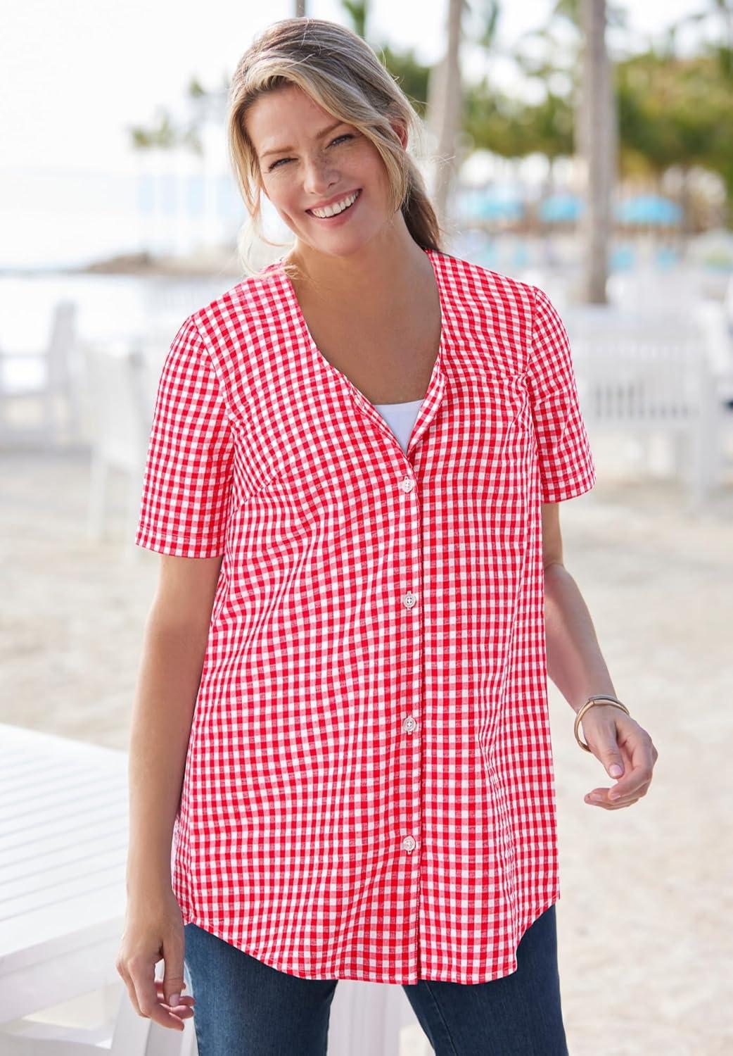 • Woman Within Plus Size Seersucker Baseball Shirt(Vivid Red Gingham)