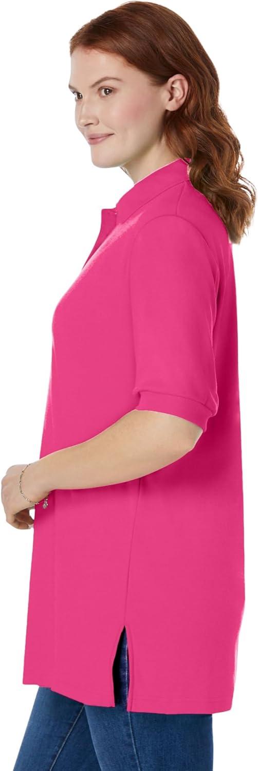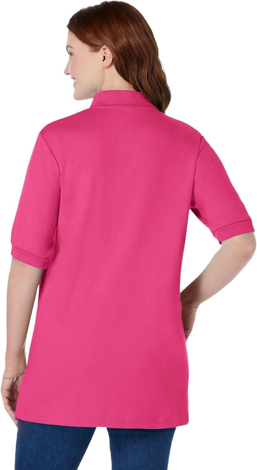Woman Within Plus Size Elbow-Sleeve Polo Tunic(Raspberry Sorbet)