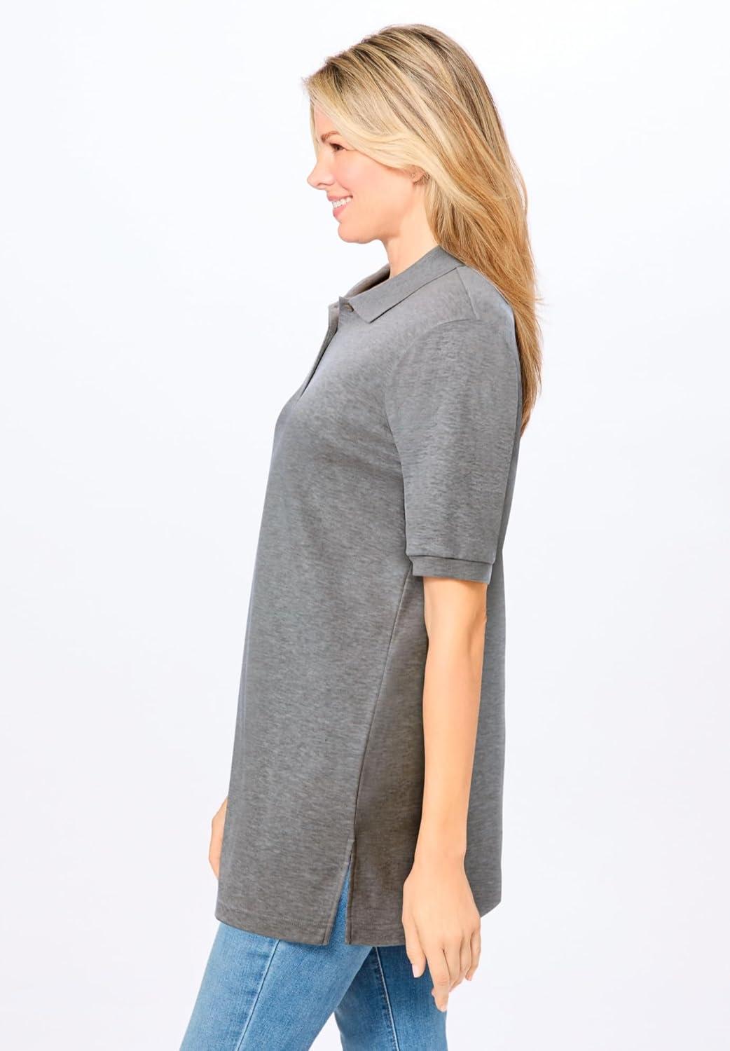 Woman Within Plus Size Elbow-Sleeve Polo Tunic(Medium Heather Grey)