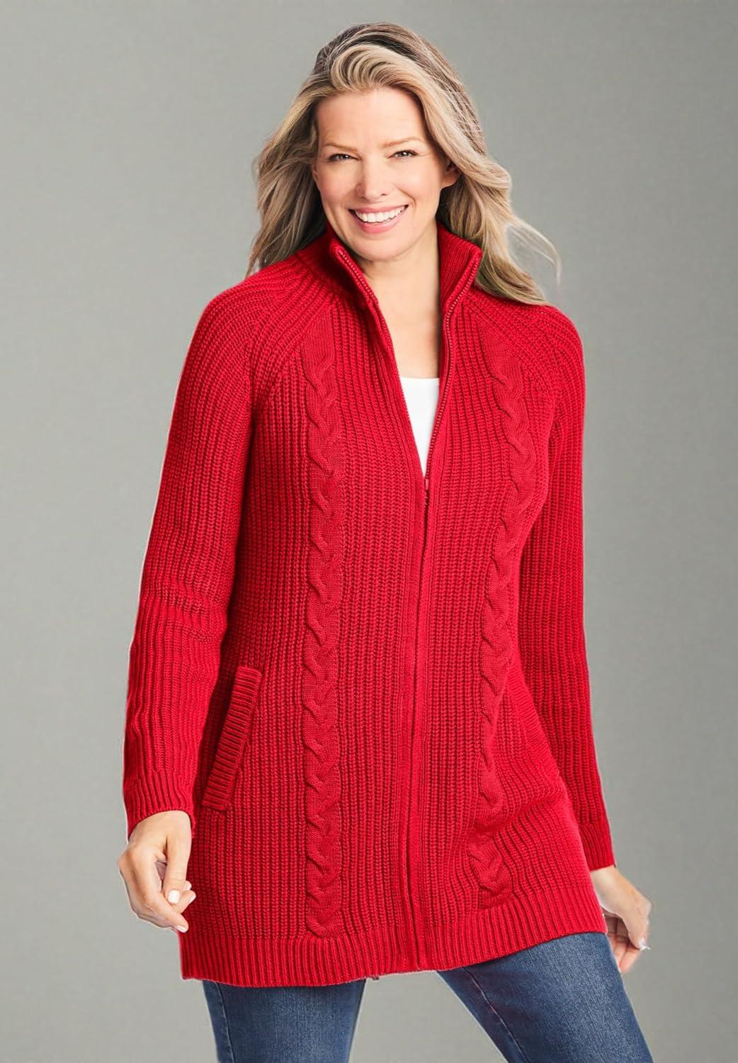 Woman Within Plus Size Cabled Zip-Front Cardigan(Vivid Red)