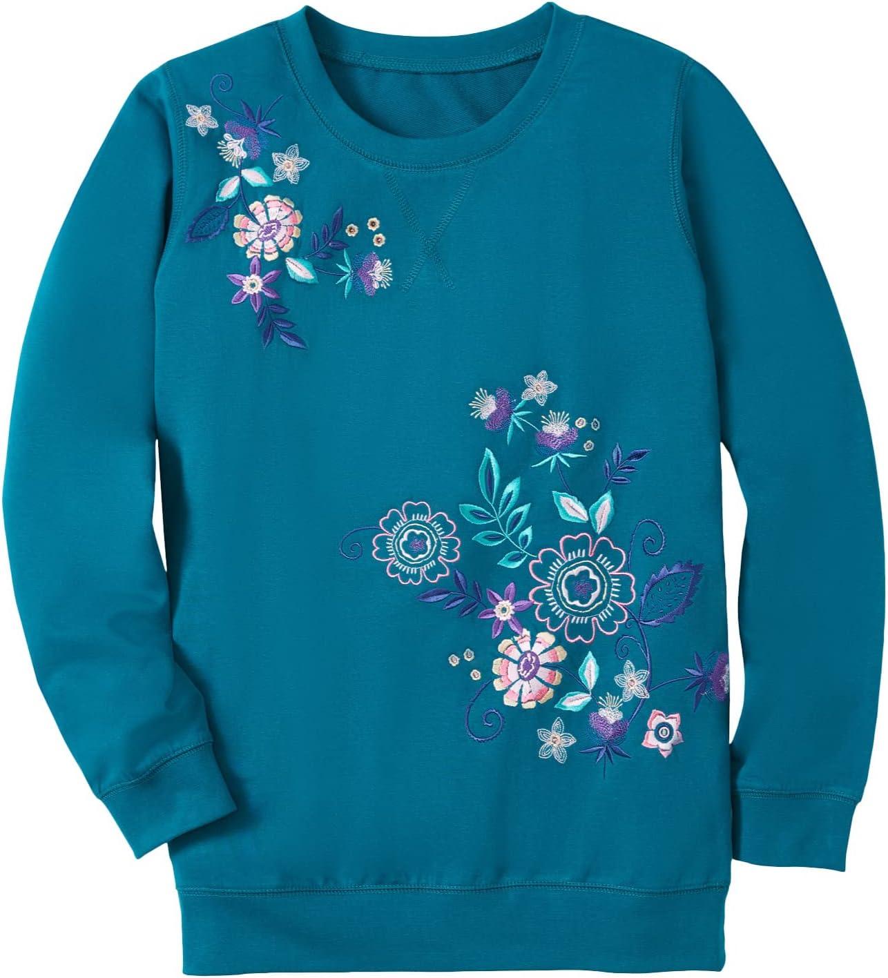 Woman Within Plus Size Printed Sweatshirt(Deep Teal Multi Floral Embroidery)