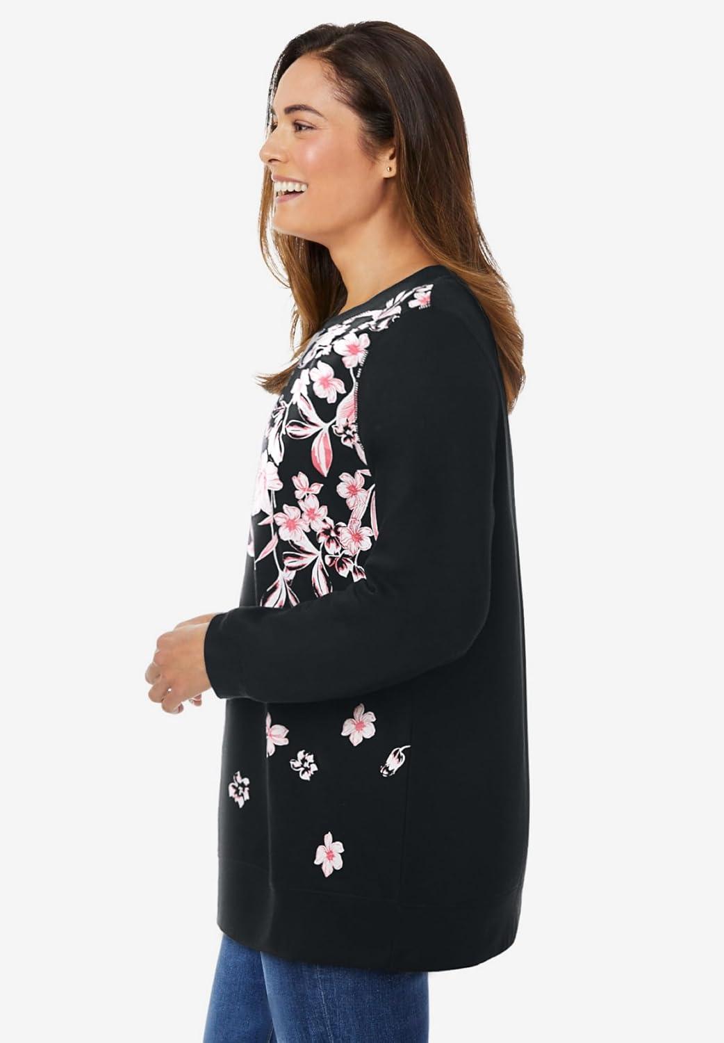 Woman Within Plus Size Printed Sweatshirt(Black Pink Floral Placement)