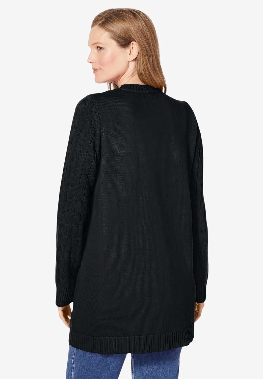 Woman Within Plus Size Cotton Cable Knit Cardigan Sweater(Black)