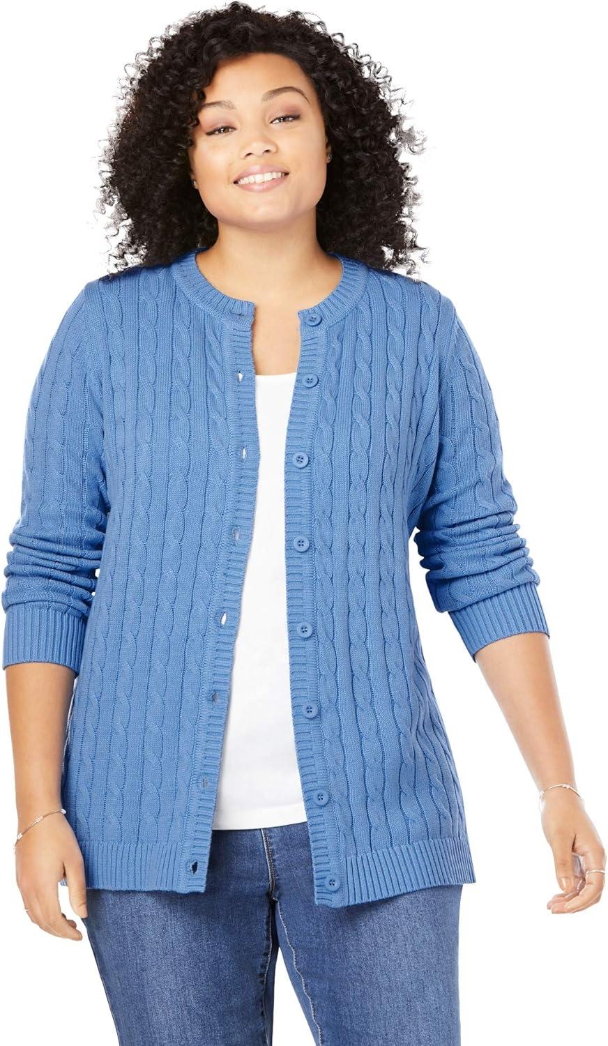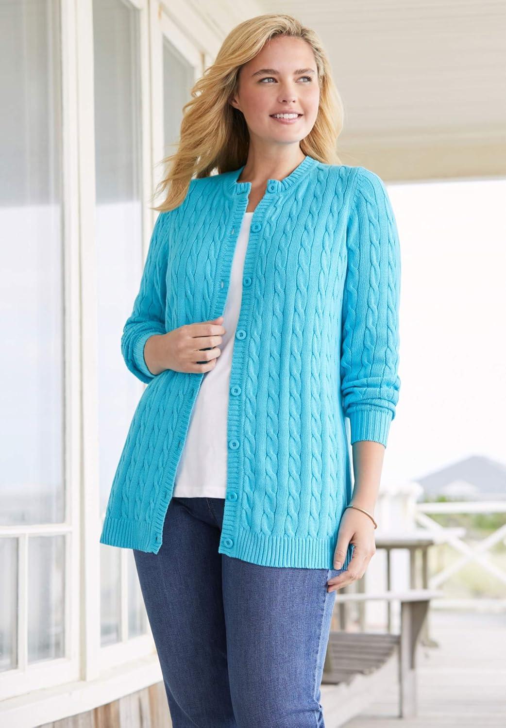 Woman Within Plus Size Cotton Cable Knit Cardigan Sweater(Bright Cobalt)