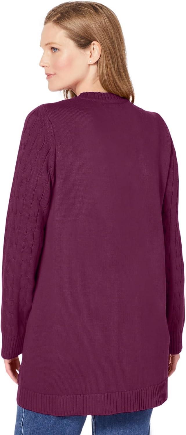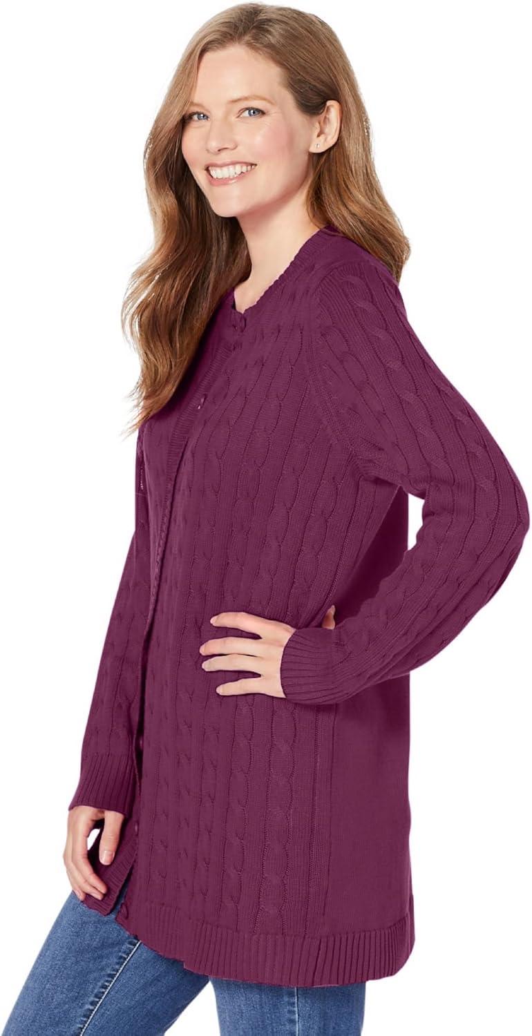 Woman Within Plus Size Cotton Cable Knit Cardigan Sweater(Deep Claret)