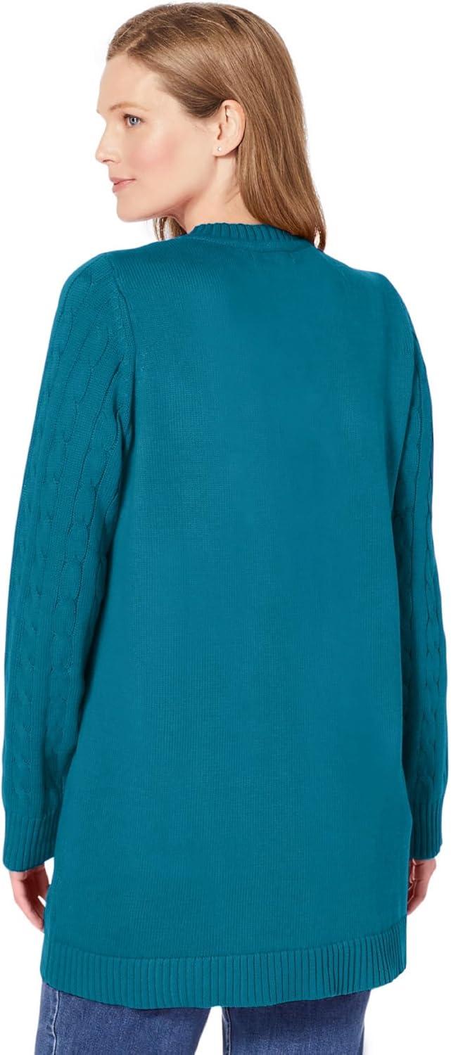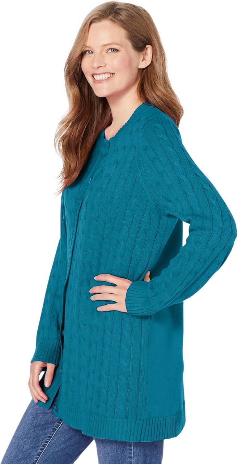 Woman Within Plus Size Cotton Cable Knit Cardigan Sweater(Deep Teal)