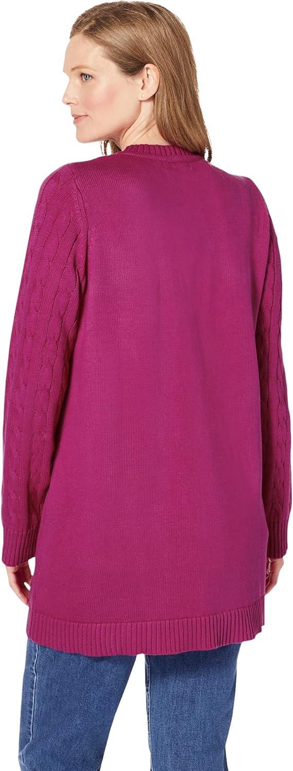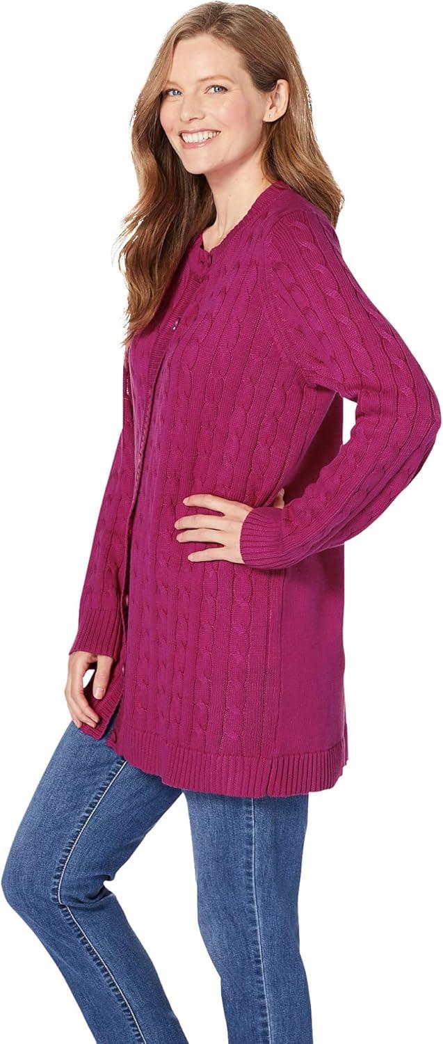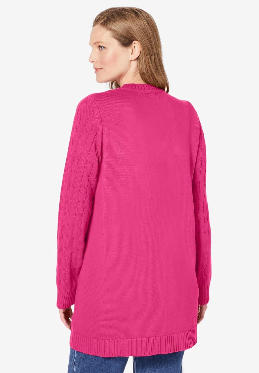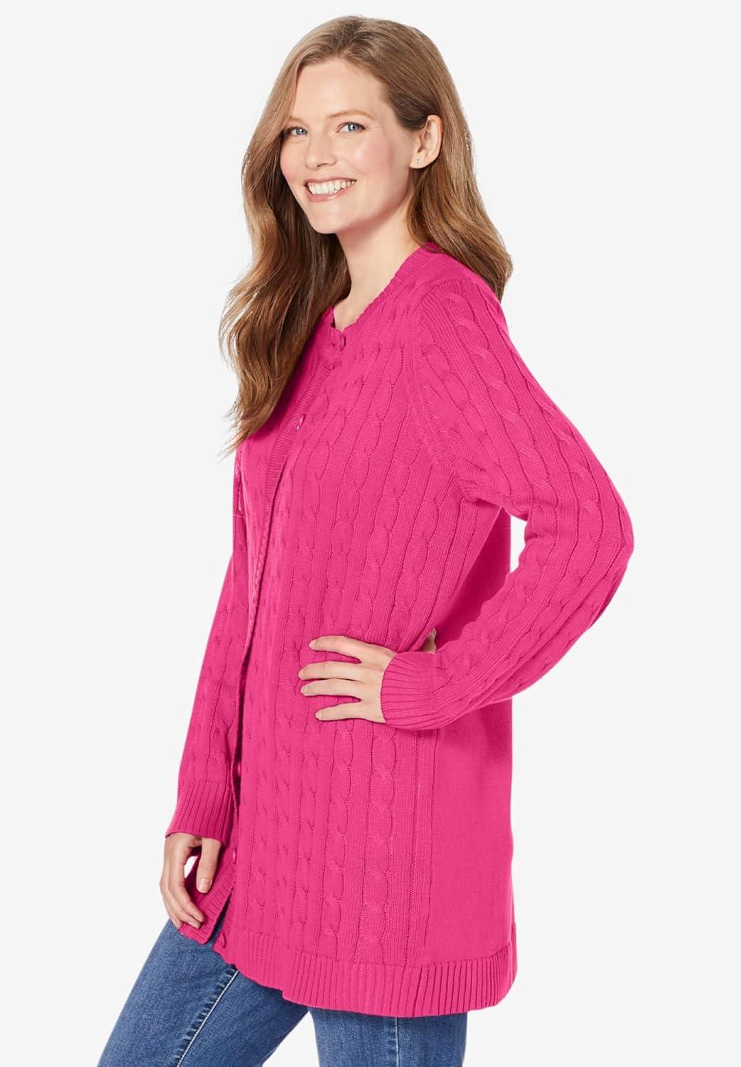 Woman Within Plus Size Cotton Cable Knit Cardigan Sweater(Raspberry Sorbet)