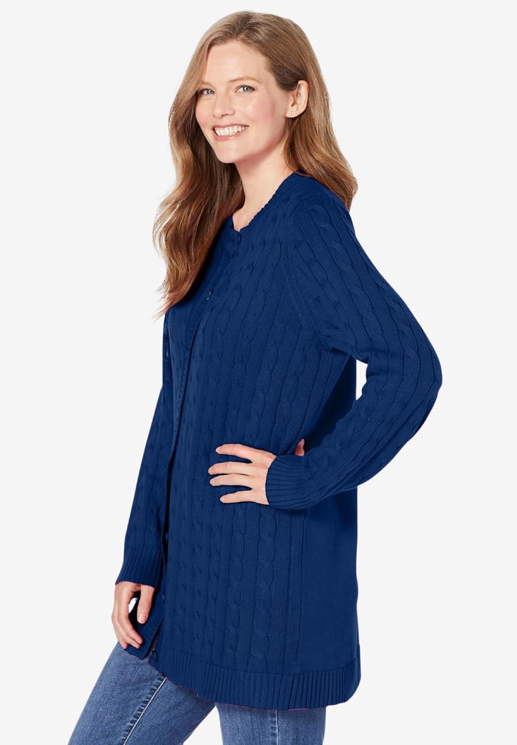 Woman Within Plus Size Cotton Cable Knit Cardigan Sweater(Evening Blue)