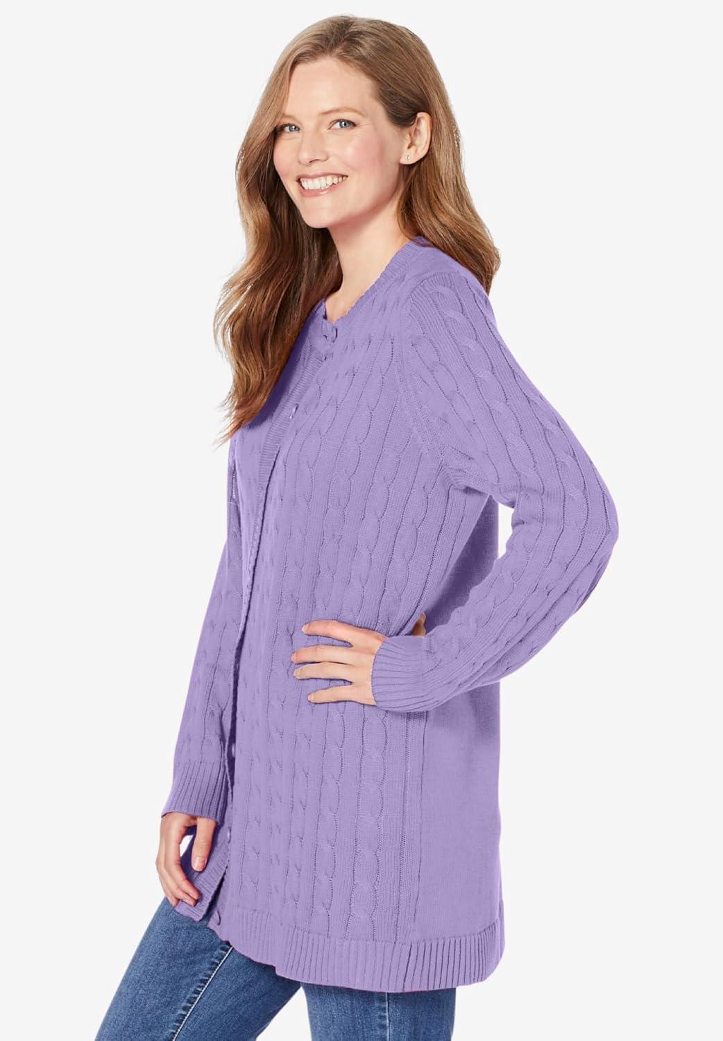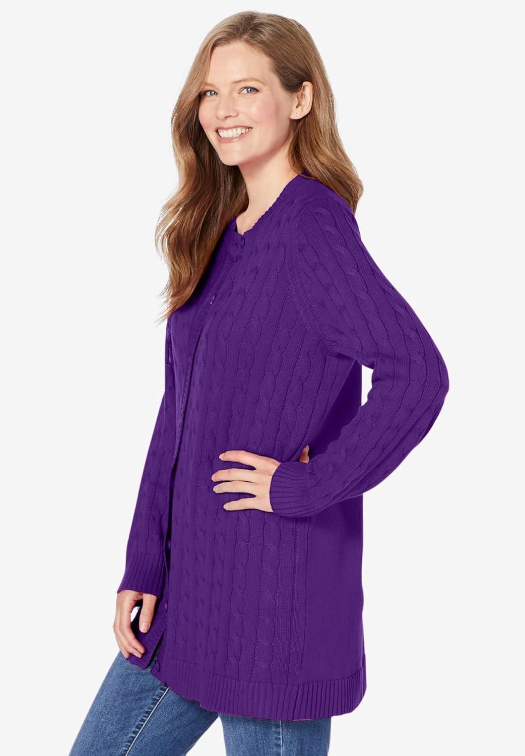 Woman Within Plus Size Cotton Cable Knit Cardigan Sweater(Radiant Purple)