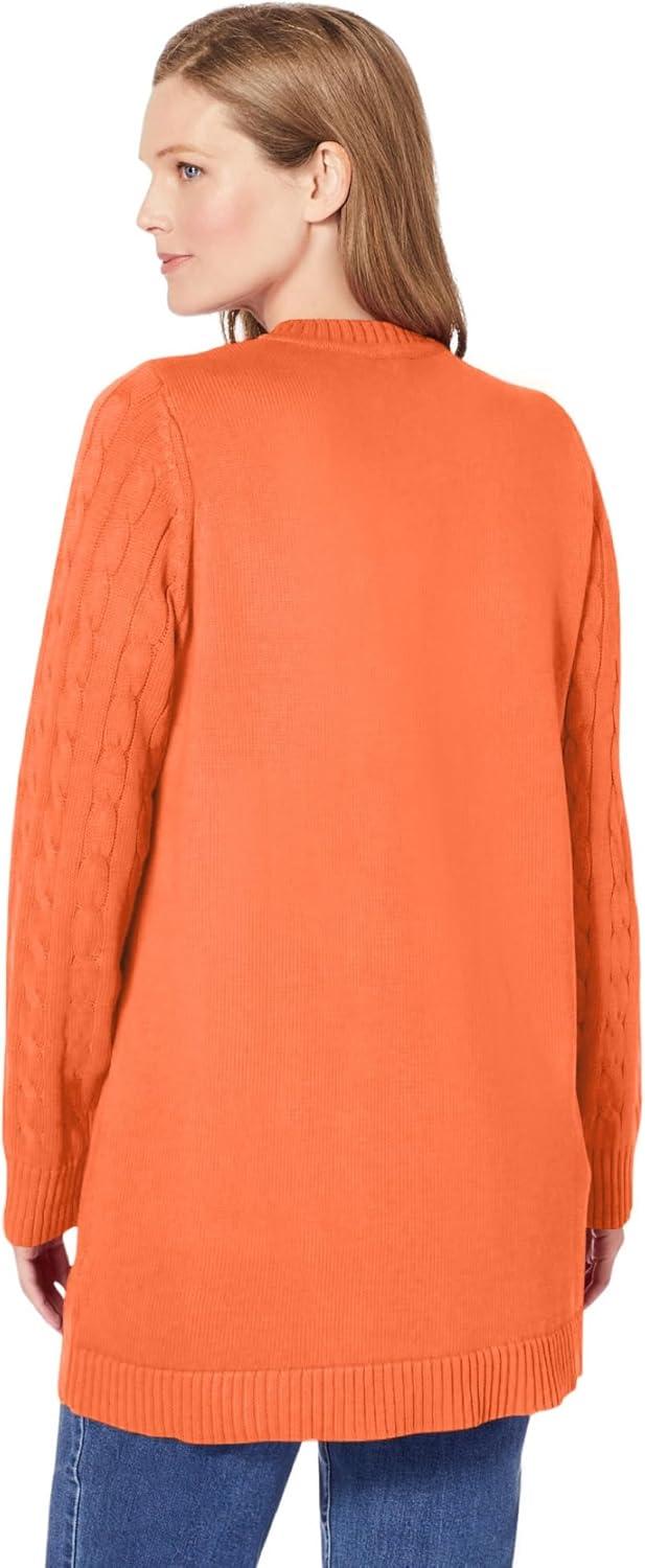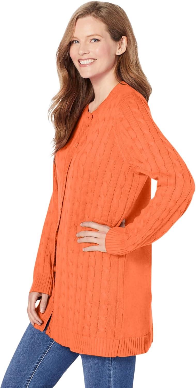 Woman Within Plus Size Cotton Cable Knit Cardigan Sweater(Vibrant Papaya)