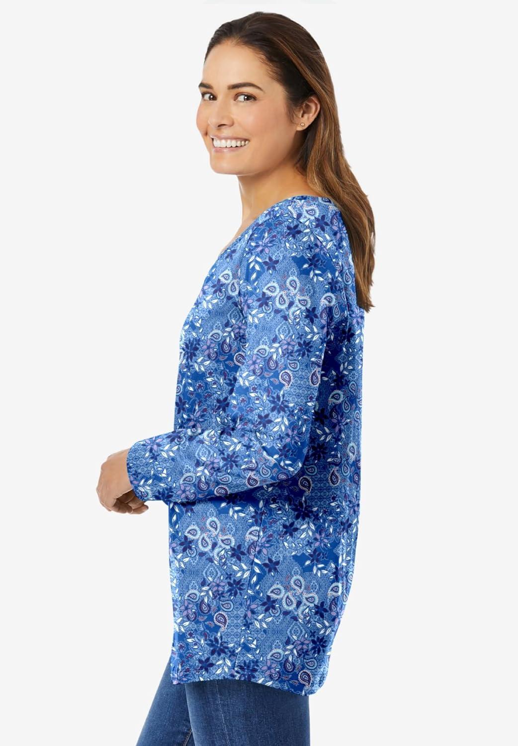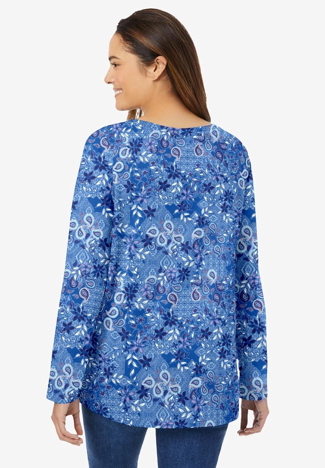 Woman Within Plus Size Perfect Printed Long-Sleeve V-Neck Tee(Bright Cobalt Patchwork)