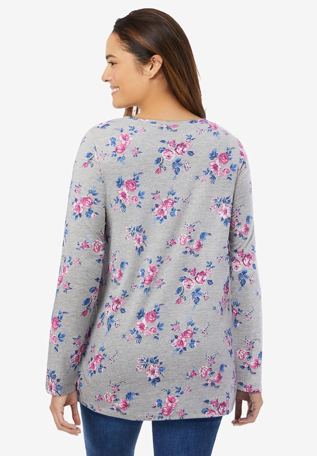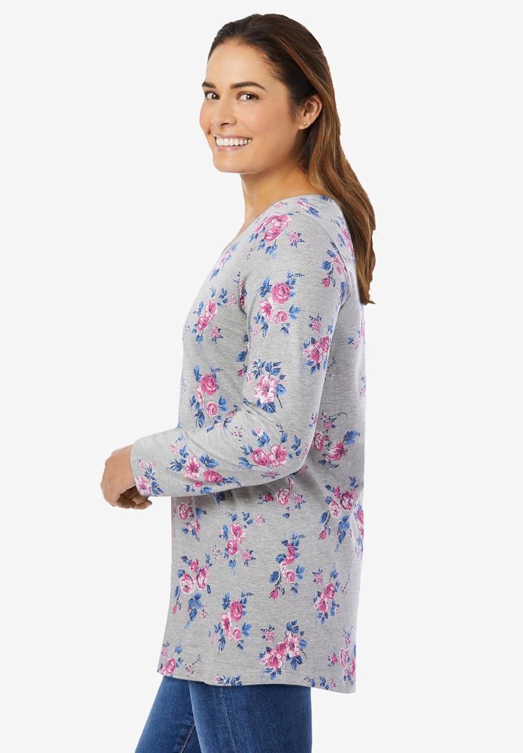 Woman Within Plus Size Perfect Printed Long-Sleeve V-Neck Tee(Heather Grey Red Pretty Floral)