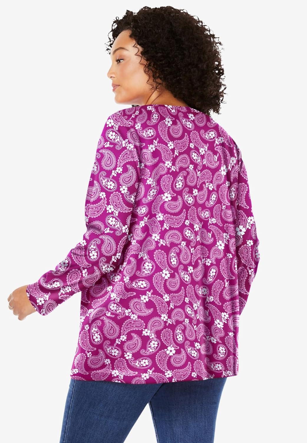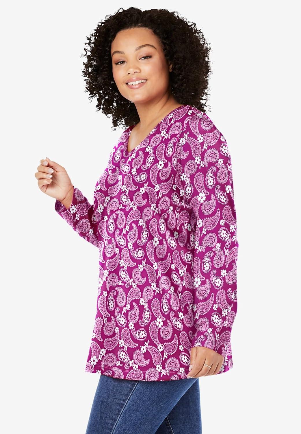Woman Within Plus Size Perfect Printed Long-Sleeve V-Neck Tee(Petal Purple Floral Paisley)