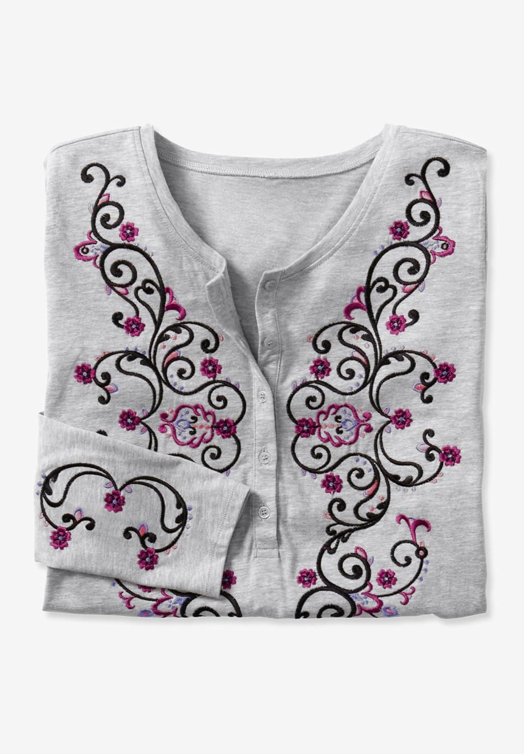 Woman Within Plus Size Embroidered Henley Tee(Heather Grey Scroll)