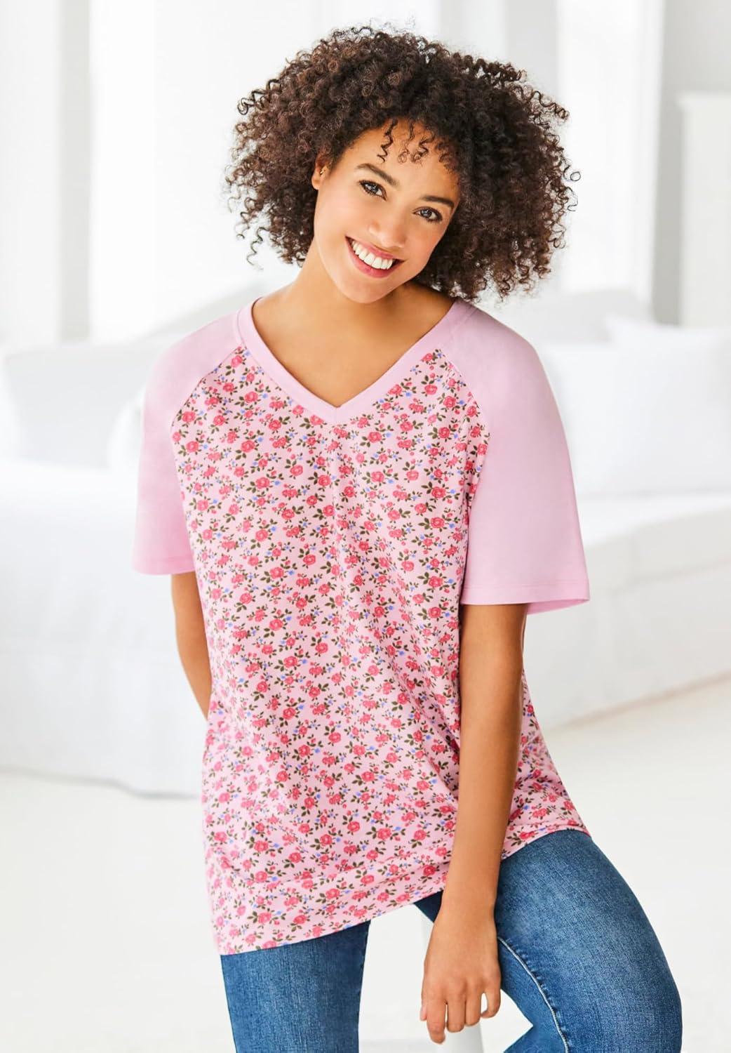 Woman Within Plus Size Elbow Sleeve V-Neck Baseball Tee(Multi Cottage Bloom)