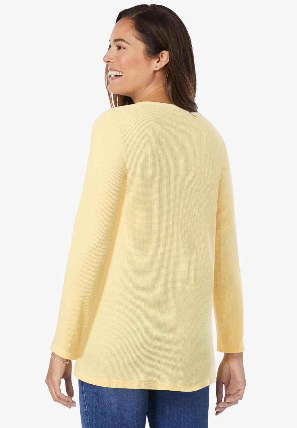 Woman Within Plus Size Embroidered Thermal Henley Tee(Banana Vine Embroidery)