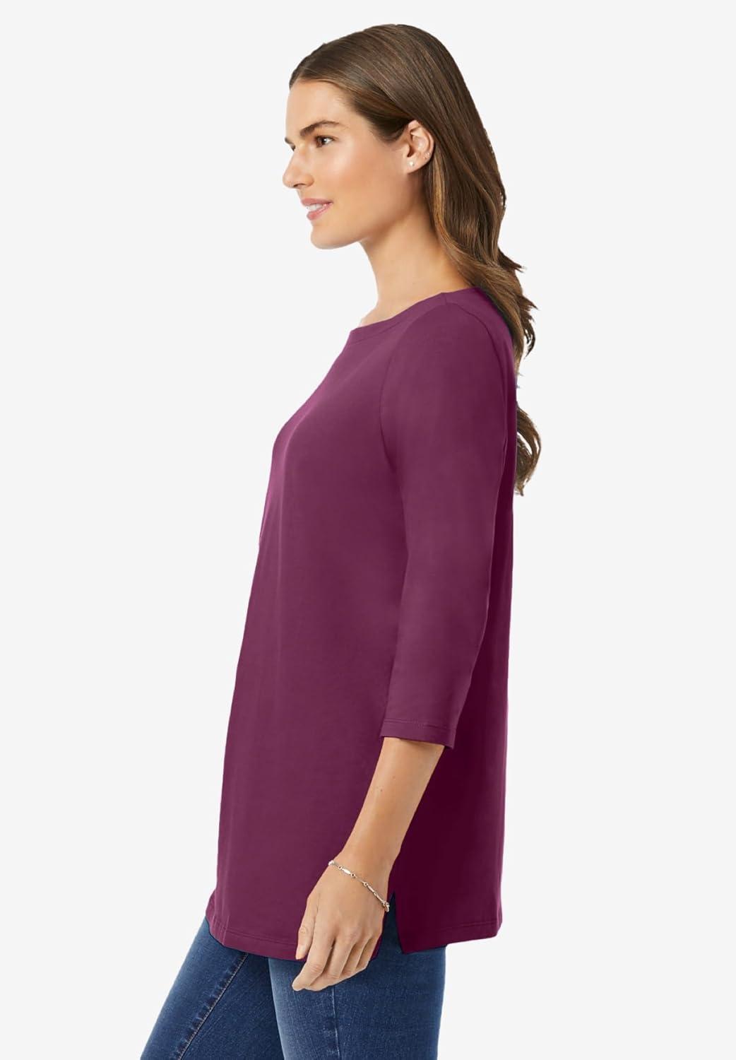 Woman Within Plus Size Perfect Three-Quarter Sleeve Boatneck Tee(Deep Claret)