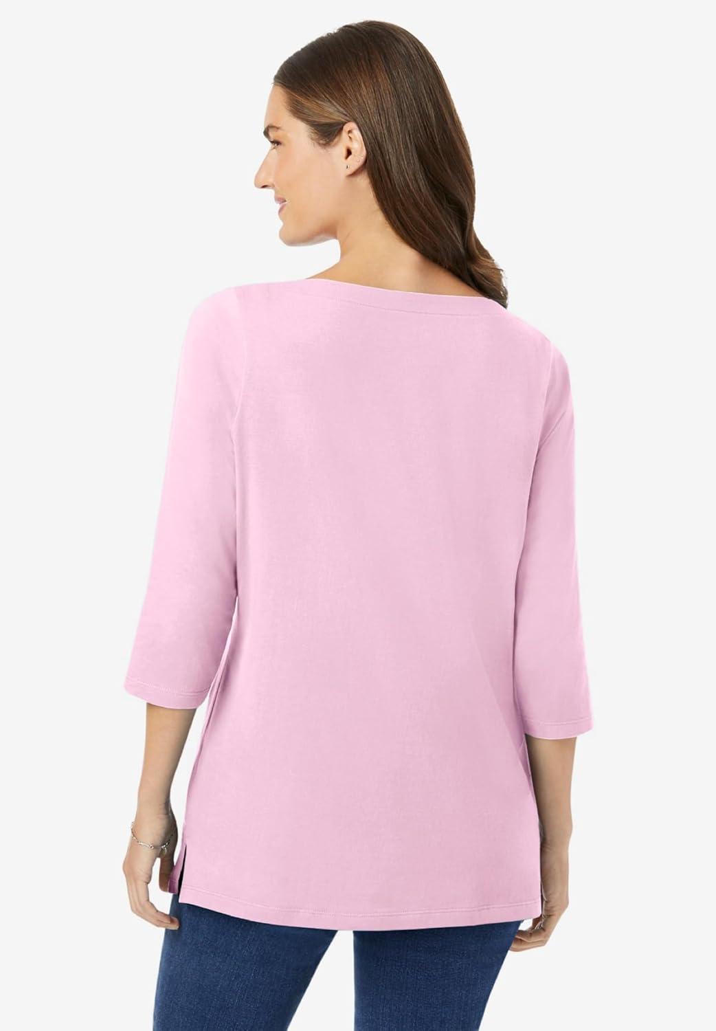 Woman Within Plus Size Perfect Three-Quarter Sleeve Boatneck Tee(Pink)