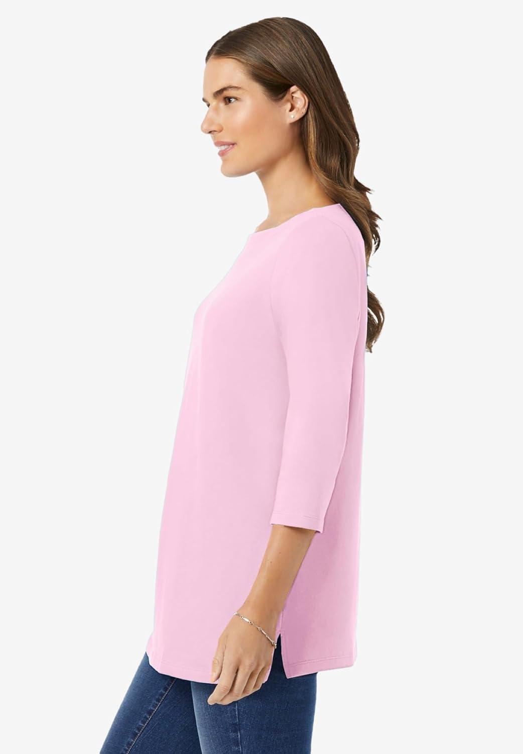• Woman Within Plus Size Perfect Three-Quarter Sleeve Boatneck Tee(Pink)