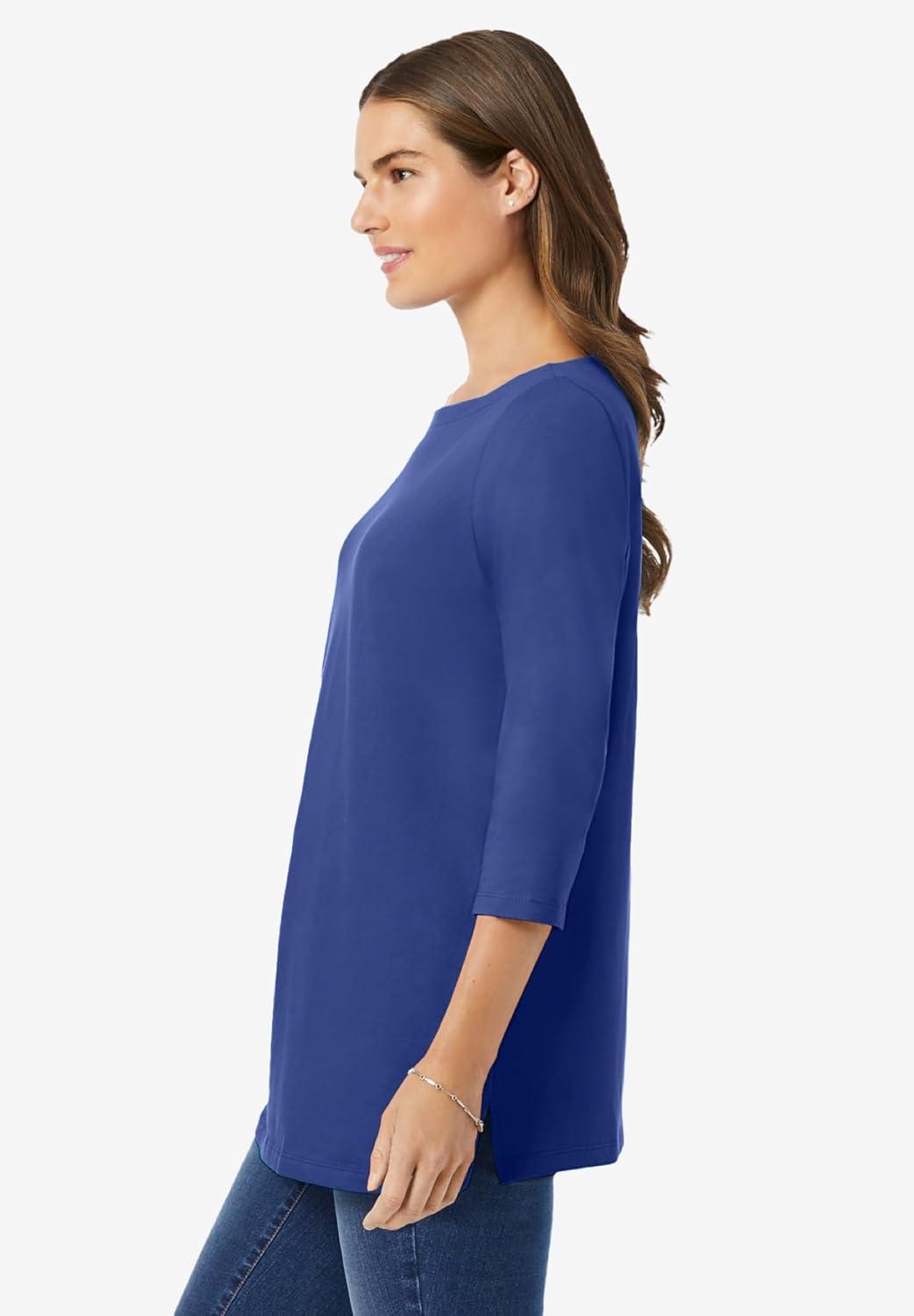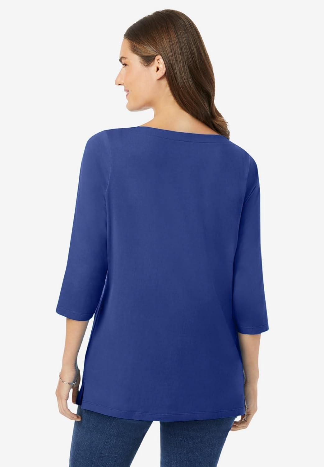 Woman Within Plus Size Perfect Three-Quarter Sleeve Boatneck Tee(Ultra Blue)