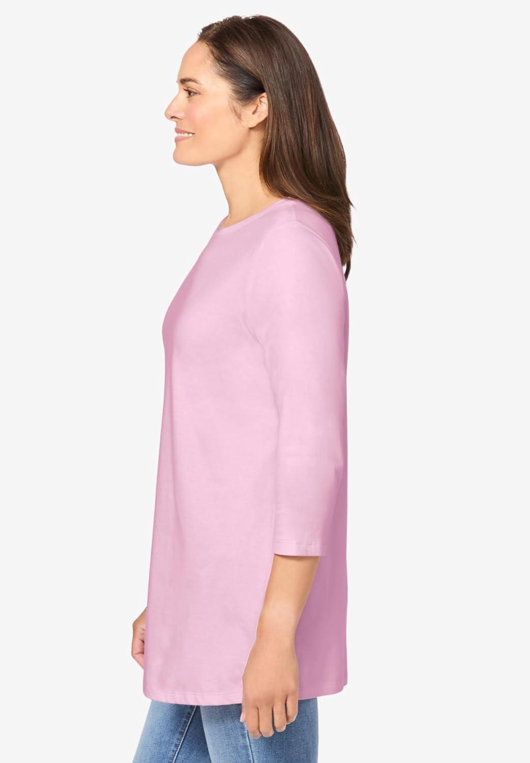 Woman Within Plus Size Perfect Three-Quarter Sleeve Crewneck Tee(Pink)