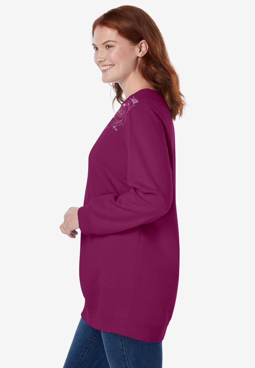 • Woman Within Plus Size Fleece Sweatshirt(Deep Claret Floral Embroidery)